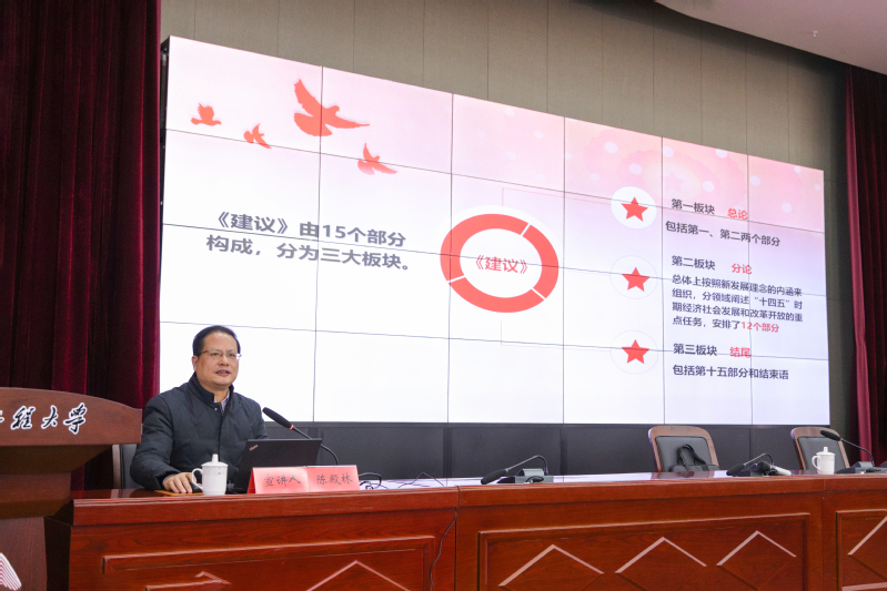 陈殿林以“把握党的十九届五中全会精神的基本逻辑”为题,从全会《建议》的框架逻辑、全会提出的实践逻辑、全会蕴含的方法逻辑3方面展开,立足“两个大局”全局,站在“两个维护”高度,紧扣党的十九届五中全会主题,紧紧围绕“新发展阶段、新发展理念、新发展格局”等方面,紧密结合安徽省实际和省委十届十二次全会精神,对规划《建议》核心要义和“十四五”时期的发展形势、指导方针、主要目标、重点任务等进行了深入的学理分析和全面系统解读。报告紧密联系大学生思想实际,他强调,要用历史眼光和辩证思维看待问题、分析问题;当代青年要进一步树立历史责任感,扛起使命担当,更加努力投入学习和工作,奋发图强,为全面建设社会主义现代化国家和美好安徽建设贡献自己的力量。