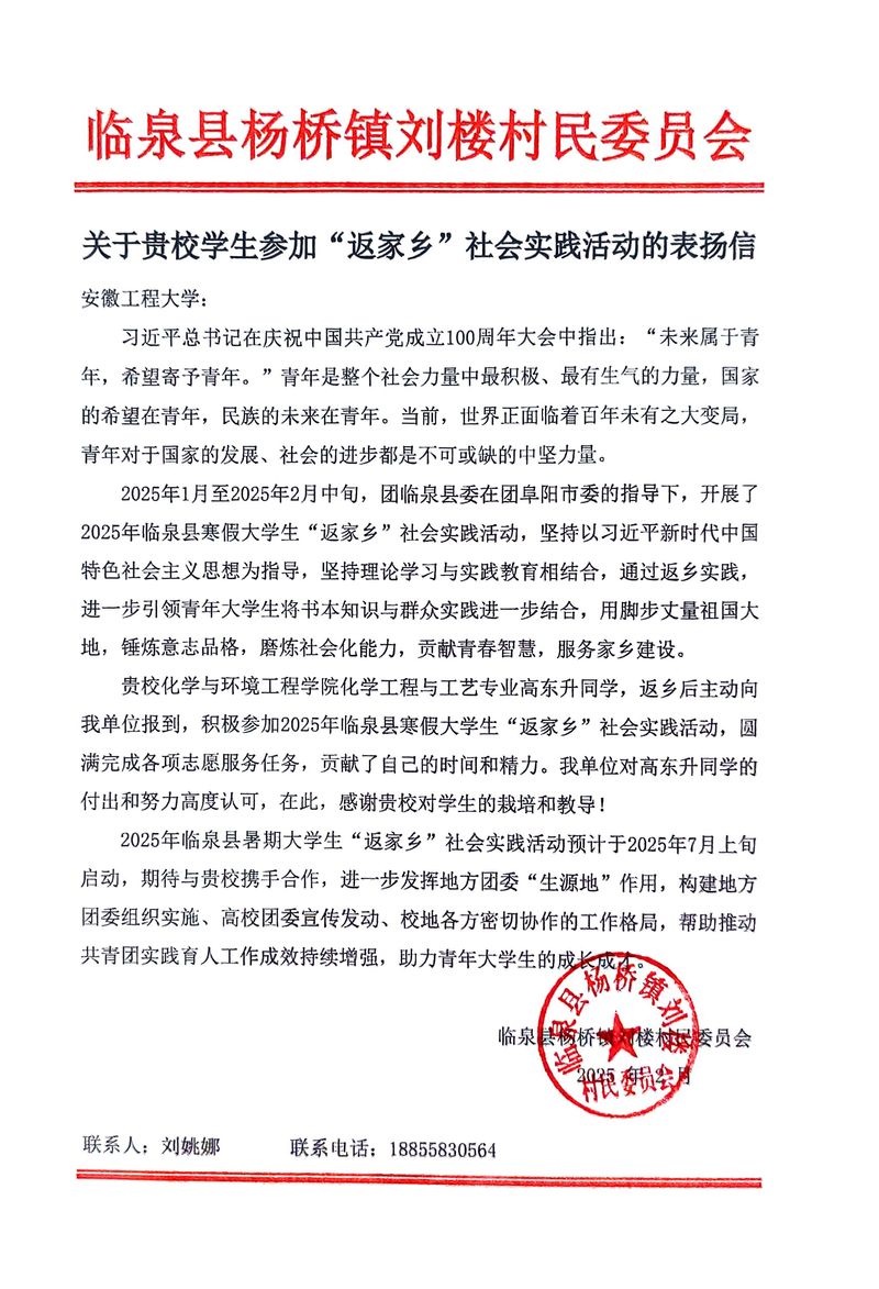 2月17日,我校化学与环境工程学院化工242班学子高东升在寒假期间积极参与“返家乡”社会实践活动,凭借出色的表现和无私奉献的精神,获得了当地相关单位的高度认可,并收到了表扬信。