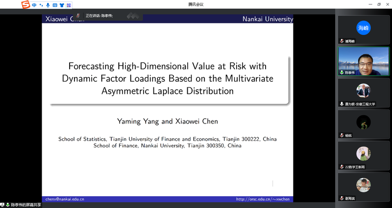 陈孝伟教授做了题为《Forecasting High-Dimensional Value at Risk with Dynamic Factor Loadings Based on the Multivariate Asymmetric Laplace Distribution》的报告。提出了一种新的分位数回归框架来预测高维股票收益的风险值。借鉴高维协方差矩阵建模研究的成功思想,将多元非对称拉普拉斯(MAL)联合分位数回归推广到时变环境。采用2001年至2021年标普100指数11个板块50只股票的面板数据为样本,实证结果表明模型产生了相对准确的样本外VaR预测。使用斜均值-方差(SMV)策略,证明了该模型有利于提高投资组合的绩效。