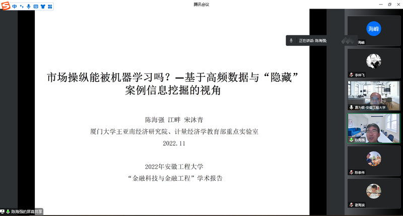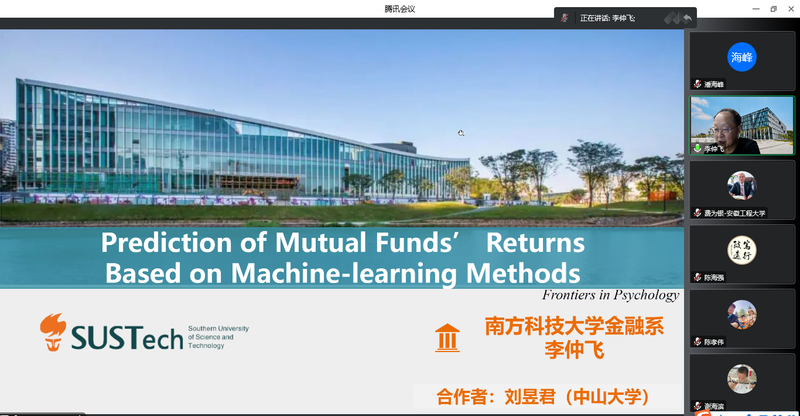 11月10日,数理与金融学院在线上举办了“金融科技与金融工程”专题系列报告会,会议邀请南方科技大学博士生导师、长江学者、国家杰青李仲飞教授,厦门大学博士生导师、王亚南经济研究院副院长陈海强教授,对外经济贸易大学博士生导师、金融科技系主任谢海滨教授,南开大学陈孝伟教授做了专题报告。校党委常委、副校长费为银,数理与金融学院副院长潘海峰,青年老师及研究生百余人参加了学术报告会。报告会由潘海峰主持。