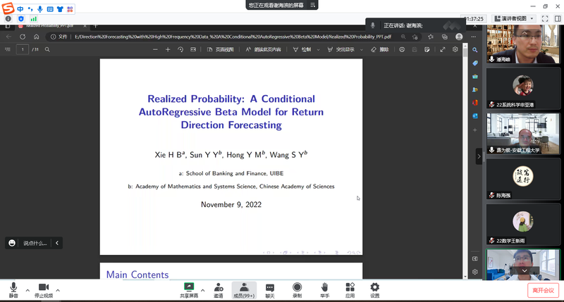 谢海滨教授做了题为《Realized Probability: A Conditional Autoregressive Beta Mode for Return Direction Forecasting》的报告。针对高频数据易获取的特点,提出了一种条件自回归贝塔分布(CARB)模型。CARB模型的动态结构类似于ARCH类型的模型,它不仅可以捕捉时变的方向变化概率,还可以捕捉概率变化的期限结构。仿真研究检验了CARB模型在有限样本中的性能,经验结果证实,CARB模型比常用的动态Probit模型获得更好的样本内和样本外方向预测。