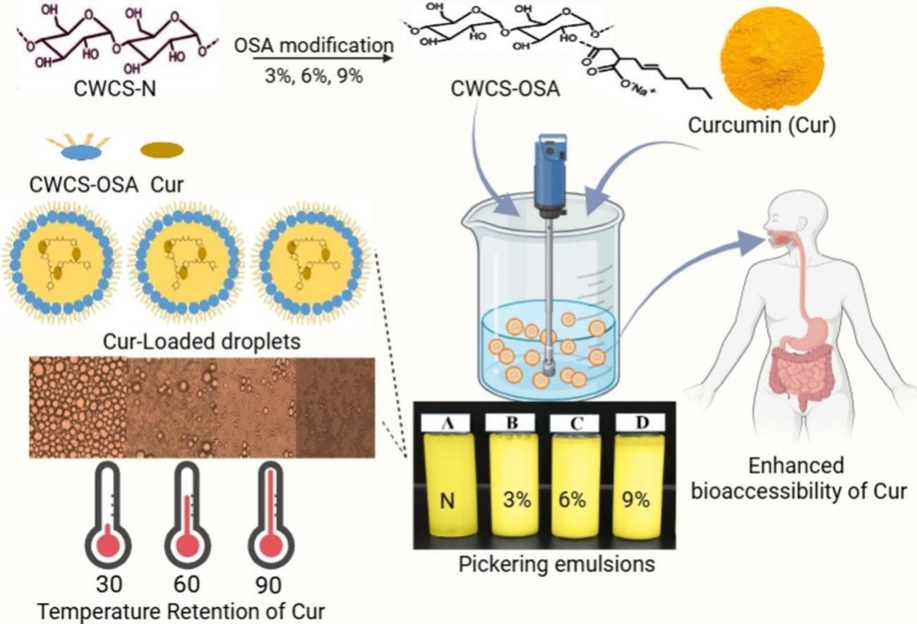 该研究涉及对从利用率较低的荸荠品种中分离出来的一种非常规淀粉进行改性,并将其与稳定的富含姜黄素的皮克林乳剂相结合,从而提高姜黄素的生物利用率和热稳定性。利用中国荸荠中分离出来的一种非常规淀粉进行改性,并将其用于制造稳定的富含姜黄素的皮克林乳剂,这种乳剂具有更高的生物利用度、热稳定性和姜黄素包埋率。