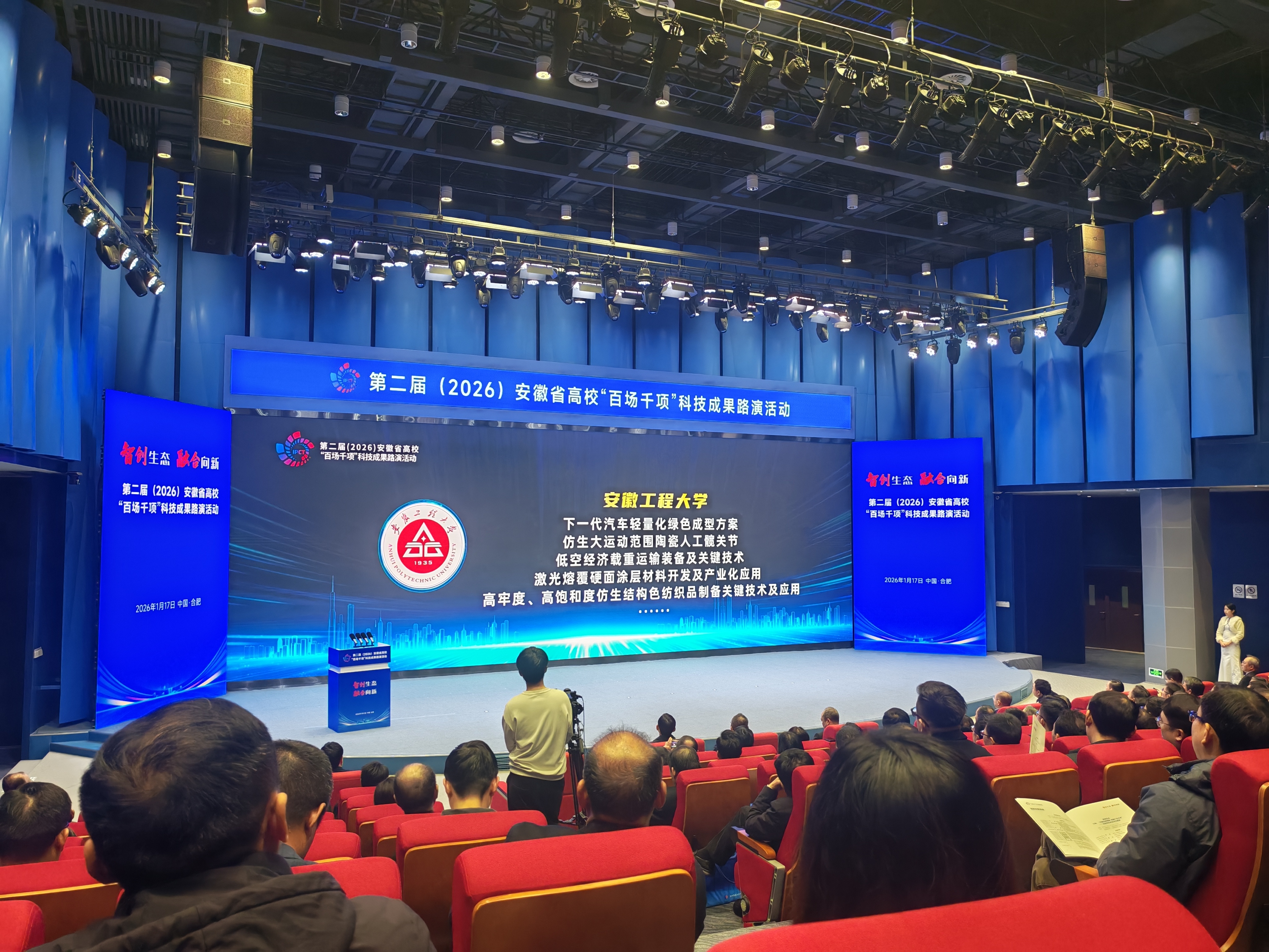 1月17日,第二届(2026)安徽省高校“百场千项”科技成果路演活动在安徽创新馆举行。安徽省教育厅、国资委、工信厅等部门相关领导出席会议。校党委书记卢平受邀出席启动仪式。该活动由省教育厅、省国资委和省工信厅主办,合肥国家大学科技园和安徽高等研究院等承办,来自全省高校、科研机构和各类企业1000余人参加了活动。整个启动仪式包括安徽省高校“百场千项”科技成果落地代表项目执照的颁发、省属企业与高校产学研合作签约、安徽省高校科技成果转化联盟成立揭牌、科技成果发布、技术需求发布和实物成果展示等活动环节。在科技成果发布环节,我校发布了“仿生大运动范围陶瓷人工髋关节”、“高牢度、高饱和度仿生结构色纺织品制备关键技术及应用”、“模内‘智’造:下一代汽车轻量化绿色成型方案”、“超净环境高灵敏度高精度宽谱尘埃粒子检测系统的研发及产业化”、“低空经济载重运输装备及关键技术”、“激光熔覆硬面涂层材料开发及产业化应用”等6项科技成果。2025年度我校积极谋划,优化机制,精准提质科技成果转化。制定了赋权转化的一系列制度文件,完善了赋权转化体系;在安徽省2025年度赋权改革试点评估中获评A类(优秀)单位,1名教师入