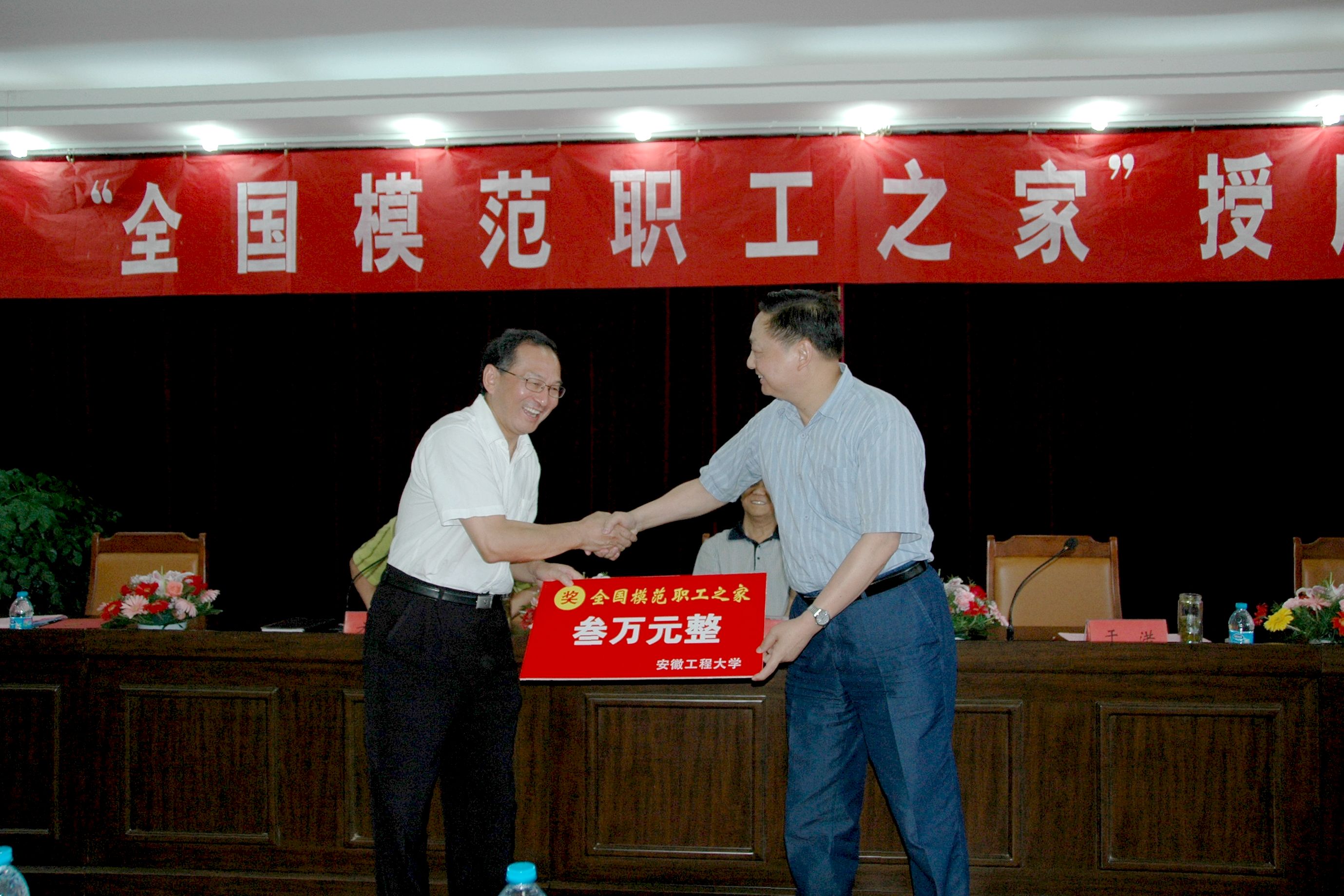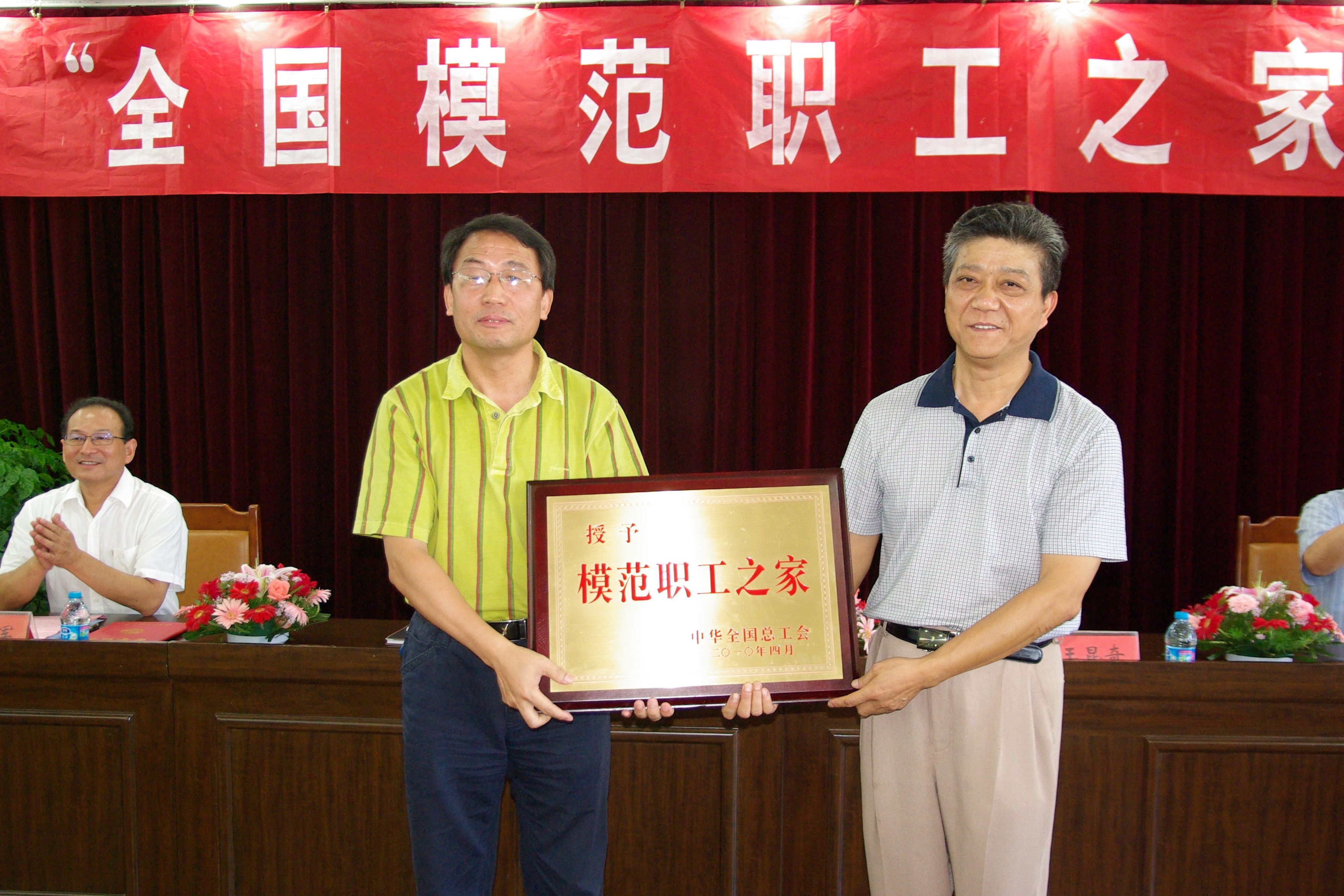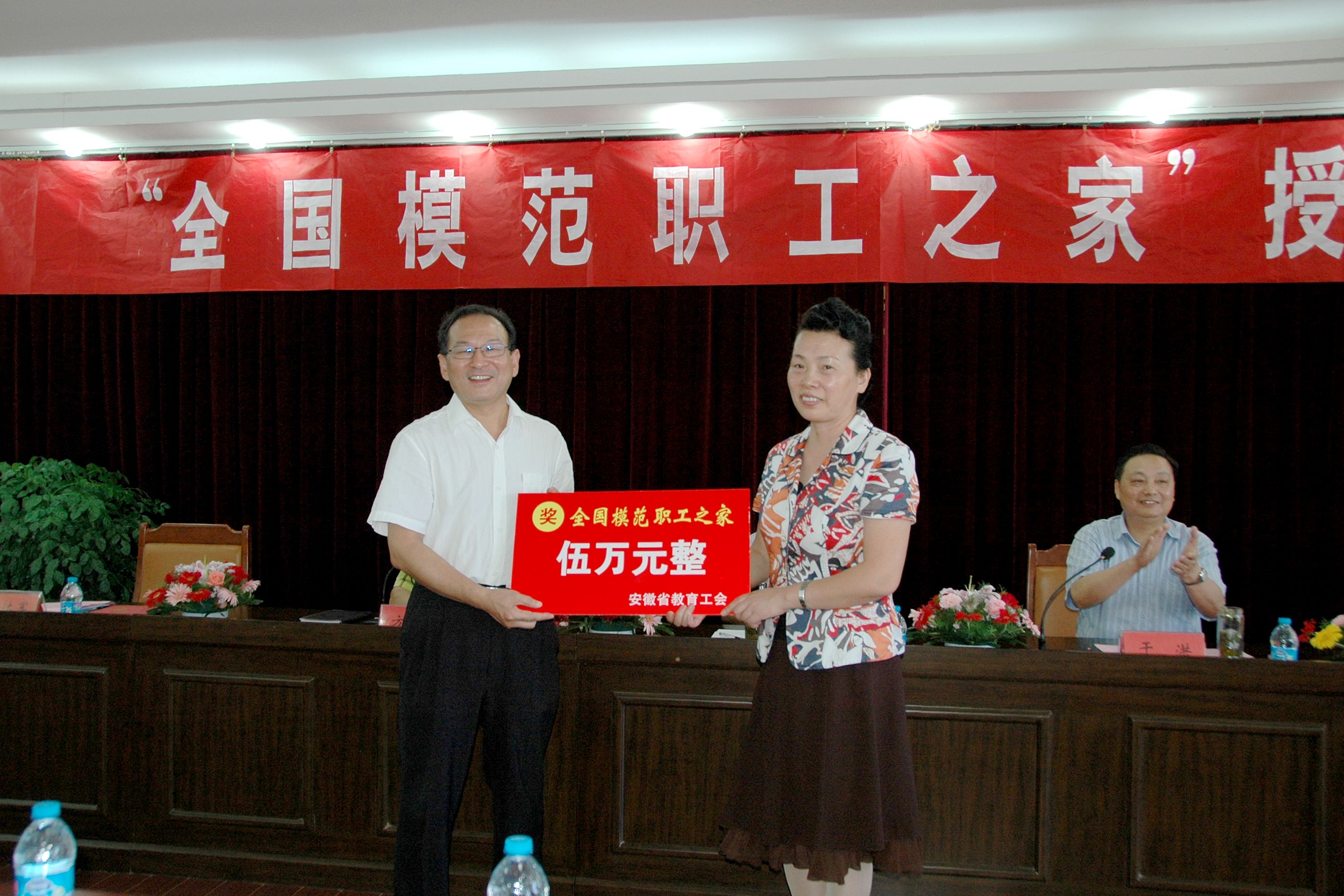 方友实首先介绍了出席授牌仪式的嘉宾,并向他们表示欢迎和感谢!省教育工会副主席王兰宣读了中华全国总工会《关于表彰全国模范职工之家、全国模范职工小家的决定》;省教育工会主席王昆奇向我校授牌,王兰副主席为校工会颁发了奖金,干洪校长代表学校向校工会颁发了配套奖金。