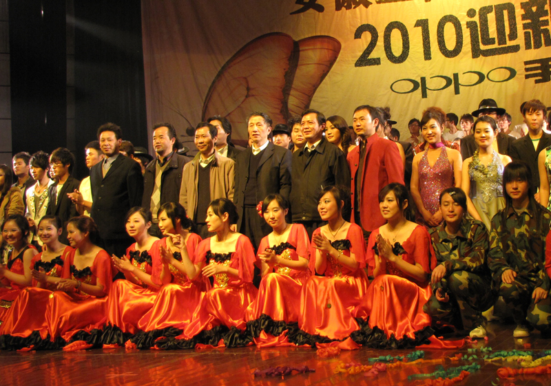 晚会结束后,在场领导上台对演出成功表示祝贺并和演员们合影留念。