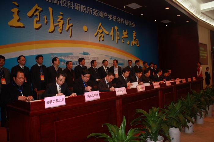 我校党委副书记、校长干洪、副校长汤斌及相关部门负责人参加了会议,干洪在会上做了主题发言,介绍了我校近年来产学研工作取得的成果,针对产学研工作存在问题进行了剖析,并提出了建议。会上汤斌代表学校与鸠江区政府签订了区校战略合作协议,科技处处长江明与奇瑞新能源汽车技术有限公司签订了“奇瑞JC22插电式混合动力轿车产业化技术创新联盟”。