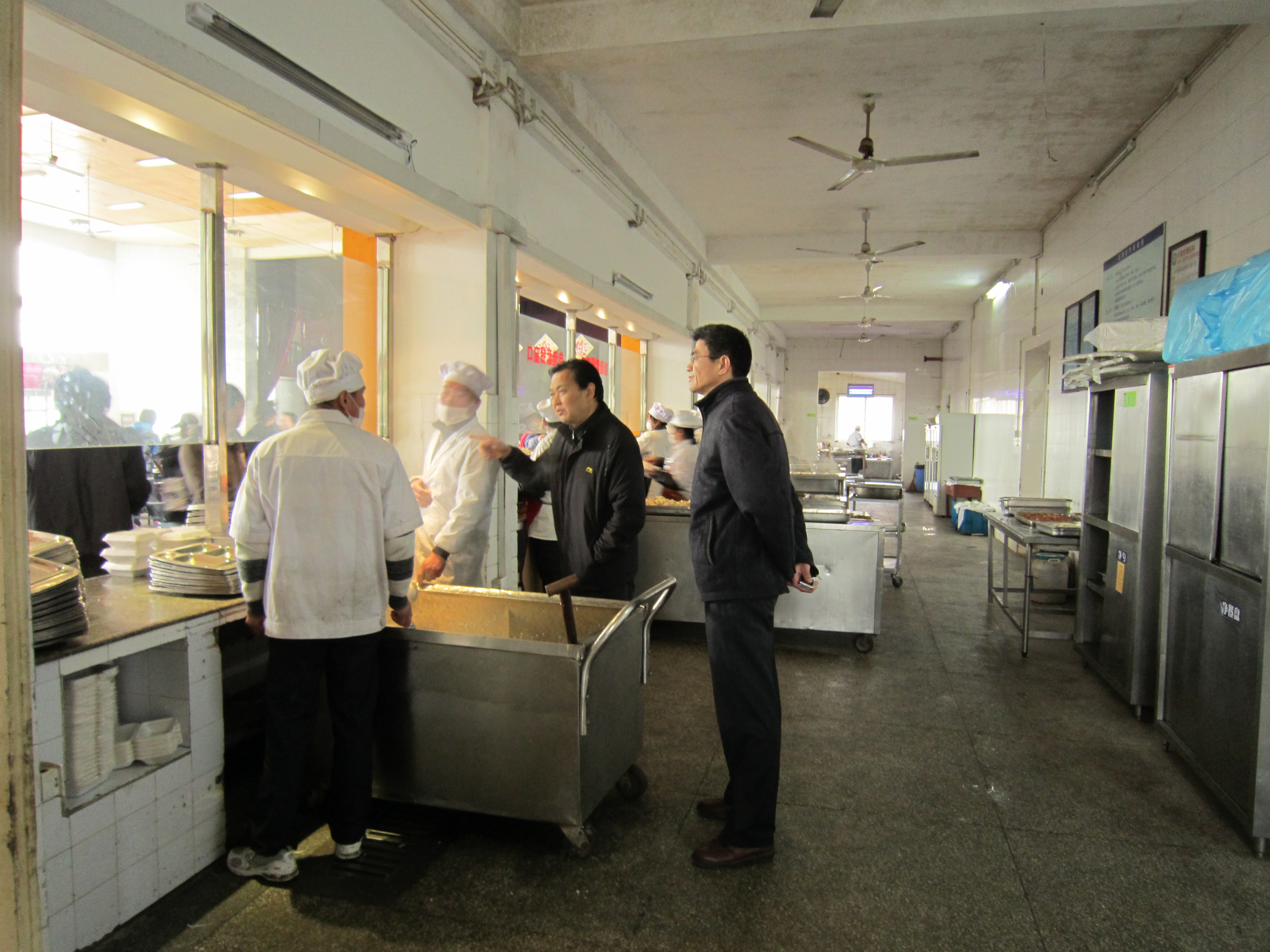 马健了解食堂总体运行情况,详细询问窗口饭菜价格,品种数量,荤素搭配情况,明码标价是否齐全。他叮嘱身边的后勤负责同志一定要保证低价菜数量和免费汤的供应。在食堂后堂马健一一查看操作间、冷库、物资周转库卫生情况,检查食品三证是否齐全,物品摆放是否规范等。他强调,要始终把食品卫生安全放在工作的首位,层层落实责任制,加强监督检查,思想丝毫不能麻痹,工作丝毫不能放松,不能存在任何侥幸心理,以确保学生食堂工作的安全稳定。当来到学生第四食堂时,看到学生伙管会同学在现场咨询,他热情地走上前去与同学亲切交谈,对他们做的工作表示感谢,鼓励他们继续发挥好信息桥梁纽带作用。在与学生一起就餐中,他详细询问他们对食堂饭菜口味、价格及服务的意见和建议,以及学生每日就餐开支情况,并就学校后勤建设规划与同学们进行简单交流。检查结束后,后勤服务集团就检查中发现的不足之处,督促整改提高。
