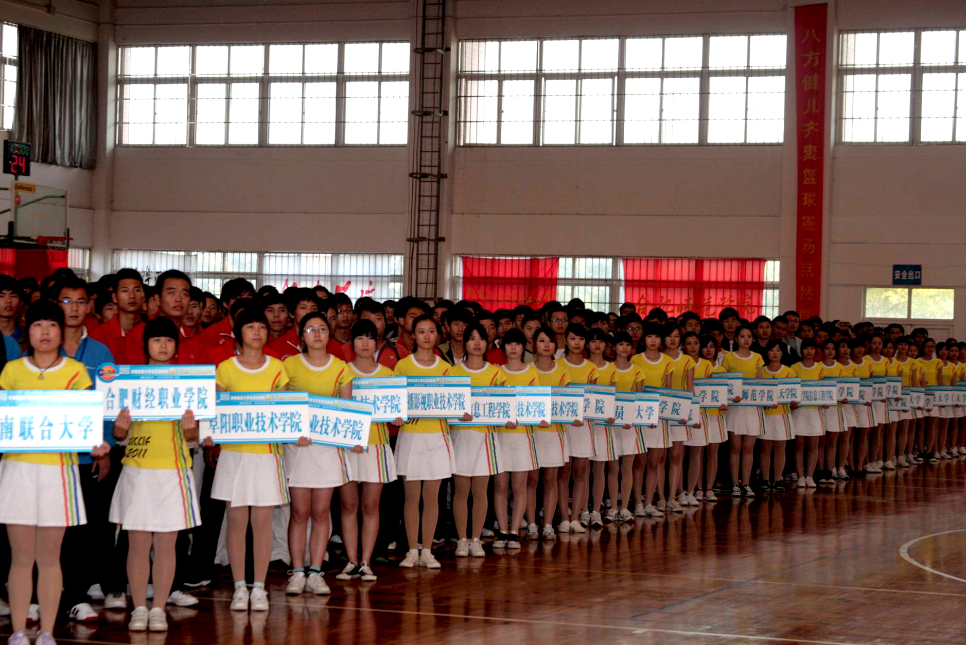 承办、安徽省学校体育卫生协会协办的“2011年安徽省大学生篮球联赛暨CUBA安徽选拔赛”在校体育馆隆重举行。安徽省教育厅副厅长江春、省教育厅体卫艺处处长宣进,安徽省学校体育卫生协会常务副理事长陈钦、裁判长梁洪涛、校党政领导干洪、叶常林出席了开幕式。