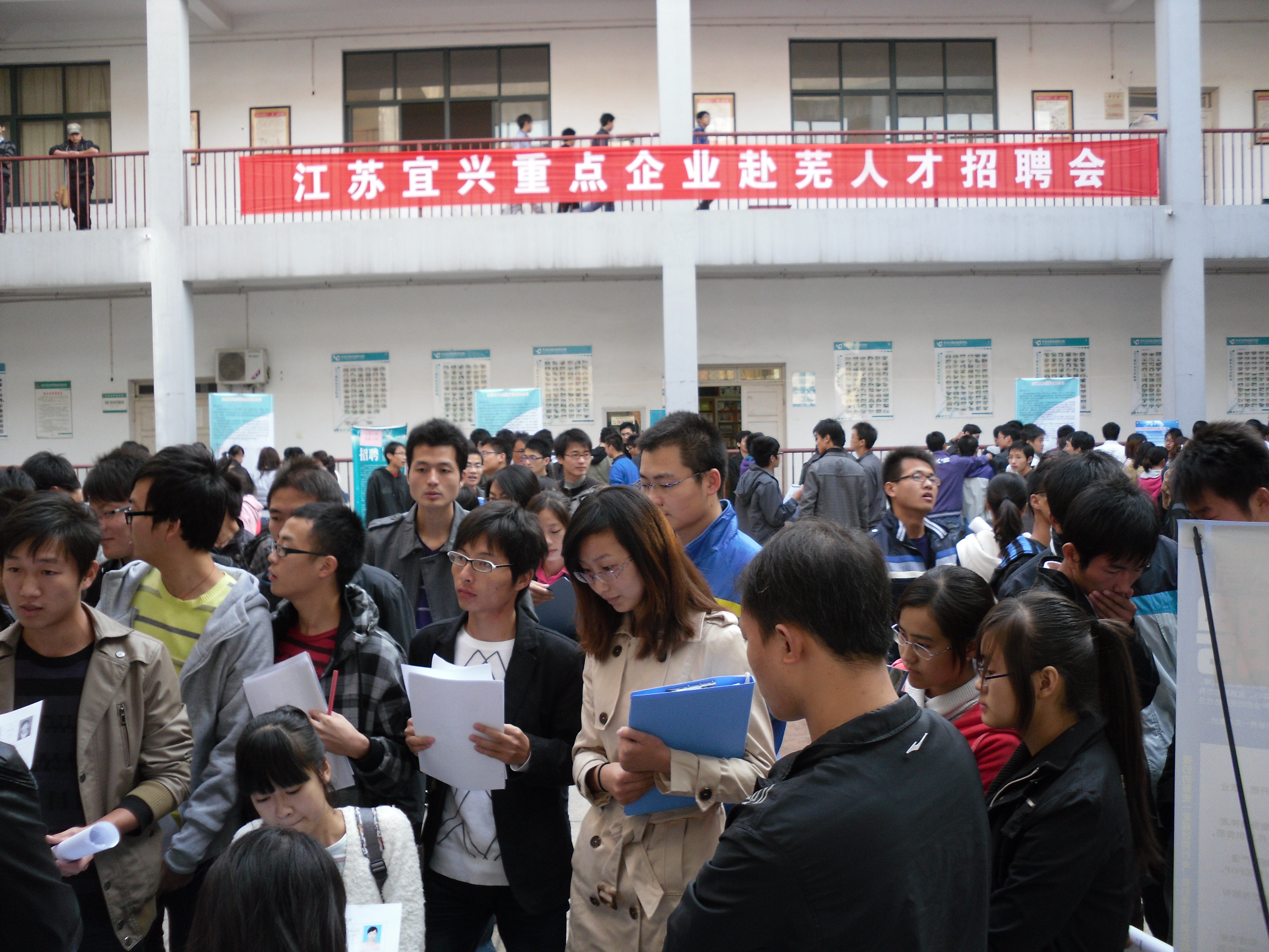 10月26日,江苏宜兴市重点企业赴芜人才招聘会在我校举行,这也是我校2012届毕业生首场组团招聘会。宜兴市人力资源和社会保障局共组织了13家当地重点企业来校招聘,招聘企业共提供有效需求岗位近400个,主要涉及机电、纺织轻化、生物环保、管理类等相关专业。我校毕业生对此次招聘会高度关注,近600名毕业生到现场咨询和应聘,整个会场气氛热烈,井然有序。现场达成就业意向260余个,招聘企业对我校毕业生的专业修养和综合素质给予很高评价,对招聘效果感到十分满意。