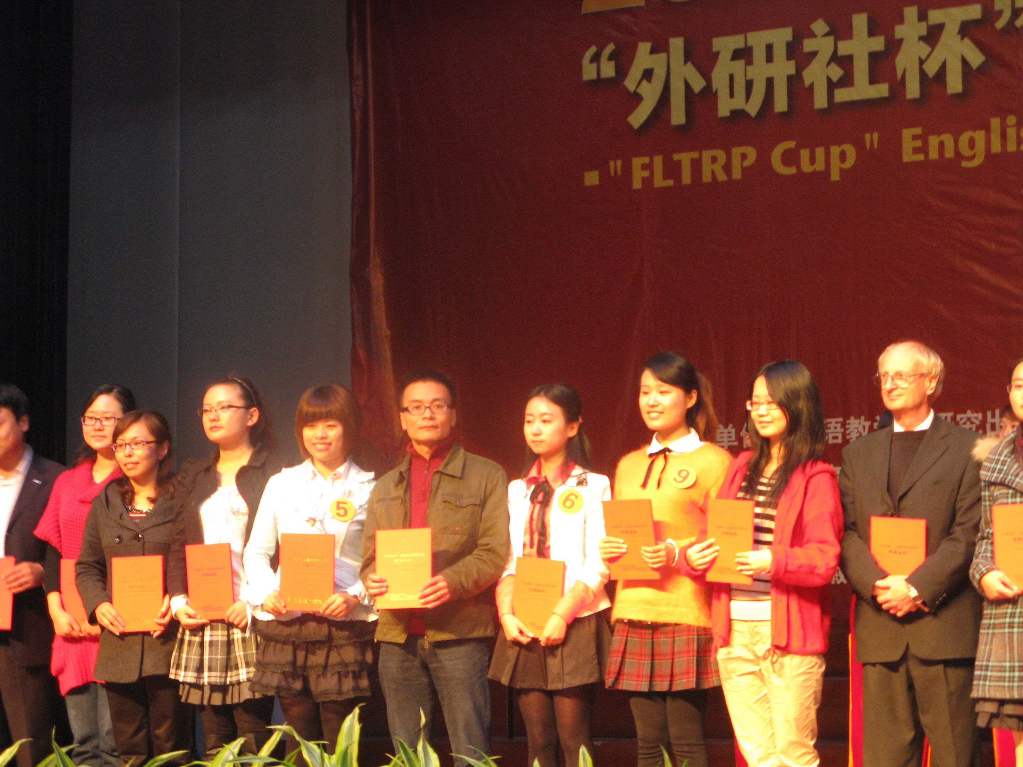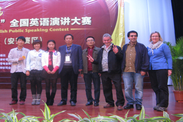 2011年“外研社杯”(原“CCTV”杯)全国大学英语演讲比赛(安徽赛区)决赛于 大赛分为复赛和决赛两个阶段,复赛包括定题演讲和回答问题,决赛分为即兴演讲、回答问题和辩论两个环节。各路选手们均做了充分的准备,竞争异常激烈和残酷。我校英语093班窦明月和蒋雅谦两位同学以纯正的语音、优雅的台风、敏捷的逻辑思维和乐观积极的精神风貌征服了评委和观众,顺利进入决赛,并在决赛阶段以良好的临场发挥以及灵活的现场应对一举拿下二等奖。同时,我校纺织083班李昂同学在大赛中也表现出色,喜获三等奖。无论从获奖人数还是获奖等级,我校均在全省高校中名列前茅,也是我校历史上在该赛事中获得的最好成绩。 外国语学院对此项比赛高度重视,在校内举行了选拔赛,通过激烈的角逐产生了3名优秀的选手参加此次决赛,赛前安排 图片说明:图1为领队金成星副院长(右2)、指导教师李新国(右1)和3名比赛选手合影。 图2为我院代表队(领队:金成星副院长;指导教师:李新国、Steve、Arash、Clare;选手:窦明月、蒋雅谦、李昂)合影。 图3为我院指导教师李新国和获奖选手窦明月、蒋雅谦在领奖台上。