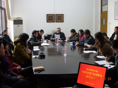 2012年1月10上午,图书馆党支部根据学校《关于对基层党组织和党员开展创先争优活动情况进行群众评议的通知》要求,在图书馆会议室召开了“创先争优”活动群众评议大会,参会党员及群众共计30人。为了开好此次会议,支部提前通知,各位党员做了充分的准备。会上,支部书记刘献民首先对支部2011年开展创先争优活动的工作进行了全面的总结和汇报,既肯定了成绩,也点明了不足之处。每位党员也结合自己的工作岗位从立足本职履责、承诺践诺情况等四个方面谈了在创先争优活动中的感受及履行承诺情况,就自身存在的问题进行了反思与自我批评,并表示在新的一年中将继续努力,在工作中创先争优。
