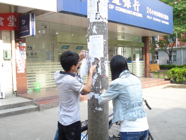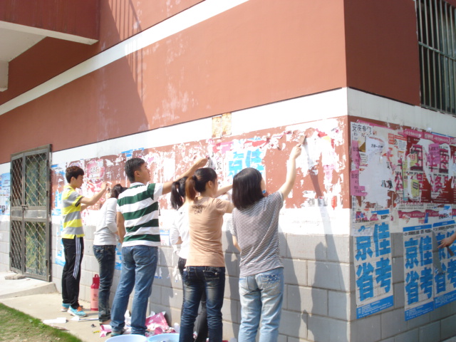马列班学员分为两大组,第一组负责清理一食堂、二食堂和第二开水房附近的乱张贴,第二组负责清理三食堂和第三开水房附近的乱张贴。学员们用自带的简易工具积极地投入到清理工作中,相互配合,较好地完成了清理任务。