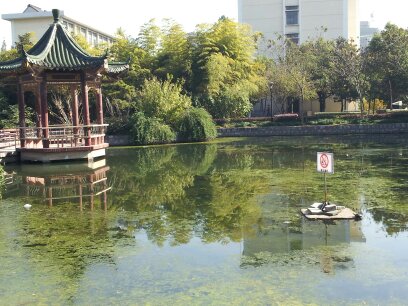 对中心水塘小景区进行水体清理,清除水体白色垃圾和水藻,投放食草鱼苗,抑制水草泛滥。