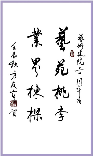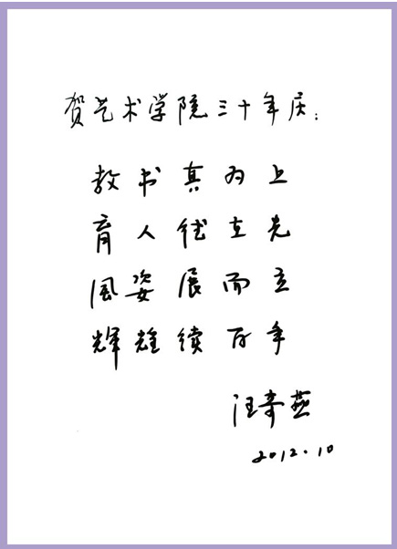 副校长李震也发表了重要讲话。为深入学习贯彻各级领导为建院三十周年题词和讲话精神, 11月19日,艺术学院召开党政联席,会上,院领导首先带头学习了这些题词和讲话,并进行了讨论。大家一致认为,各级领导为艺术学院建院三十周年的题词和讲话,既是对艺术学院过去三十年办学成绩的肯定,更是对艺术学院今后发展的期盼。下一步,艺术学院将组织全体教工学习贯彻各级领导为建院三十周年题词和讲话精神,贯彻不久前校党委书记陈其工到艺术学院调研讲话精神,以学院三十周年的成就为新的起点,不辜负领导的重托和社会的期望,以“集中力量、重点突破、带动整体”为基本思路,以专业与学科建设为核心,以人才队伍建设为重点,加大师资队伍建设,加强学院内涵建设,全面推进教育事业“十二五”发展规划的贯彻落实。