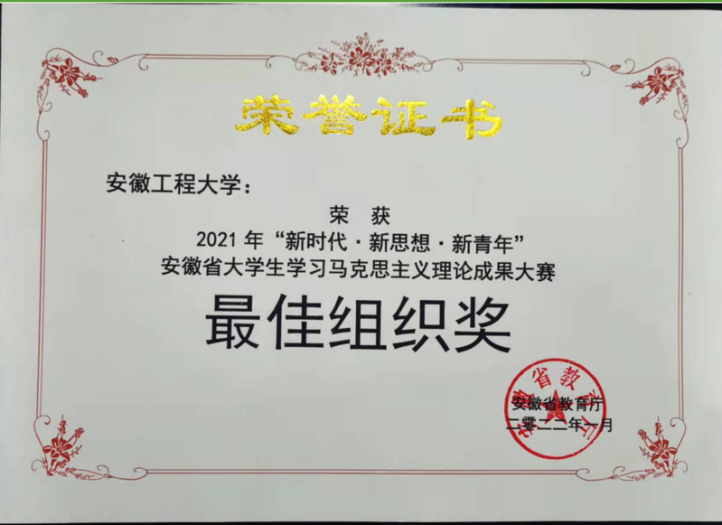 本网讯 近日,安徽省教育厅公布2021年“新时代·新思想·新青年”安徽省大学生学习马克思主义理论成果大赛结果。我校遴选报送的7件优秀作品获得一等奖2项、二等奖2项、三等奖3项,学校以总成绩第一获得最佳组织奖。