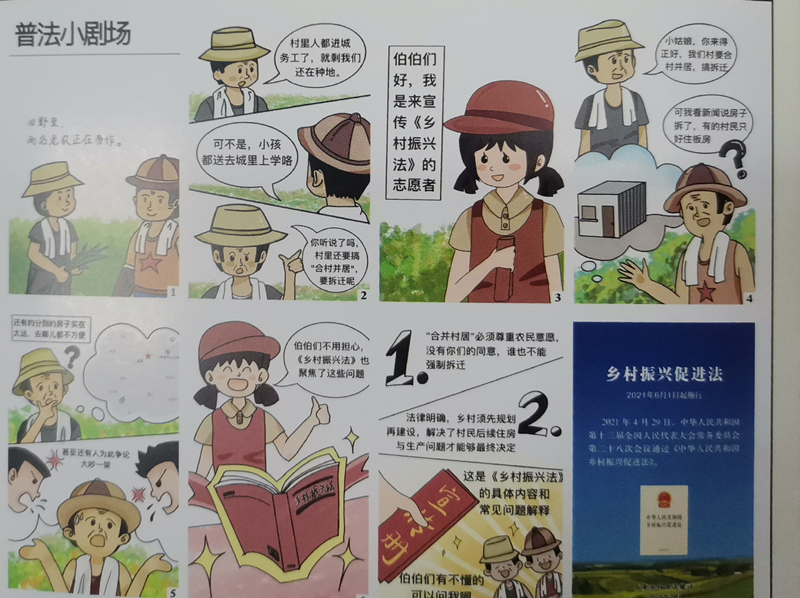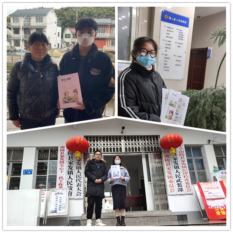走进基层,实地实践普法。1月25日以来,小分队分为四个工作组,就近就便走进基层开展法治宣传。黄山组代表孙健在祁门县安凌镇芦荔村村委会开展《乡村振兴促进法》相关法律知识宣讲,向村民赠送《普法小剧场》宣传册。阜阳组代表刘珂在颍上县人民检察院发放《普法小剧场》宣传册,检察院工作人员肯定了法治宣传方式,并提出与相关部门联动开展合作的建议。滁州组成员刘伊敏在龙蟠街道陡岗社区,围绕社区法治宣传进行实地访谈,向居民赠送普法宣传春联。芜湖组代表章鹏在南陵县家发镇开展法律宣传和调研,家发镇团委负责人表示,“用文创作品来宣传法律是很好的创意,未来的宣讲一定会更好。”