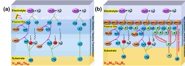 各种离子和电子在硫酸溶液中的传输和钝化膜形成示意图:(a)Ir35Ni25Ta40非晶合金;(b)Ir35Ni20Ta40B5非晶合金