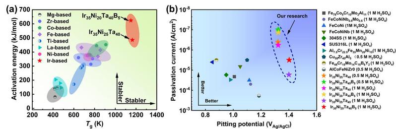 (a)Ir-Ni-Ta-(B)非晶合金与其他合金体系的结晶活化能和Tg比较图。红色虚线圆圈标记了这项工作中的研究样本;(b)在硫酸溶液中各种材料的击穿电位和钝化电流的比较图