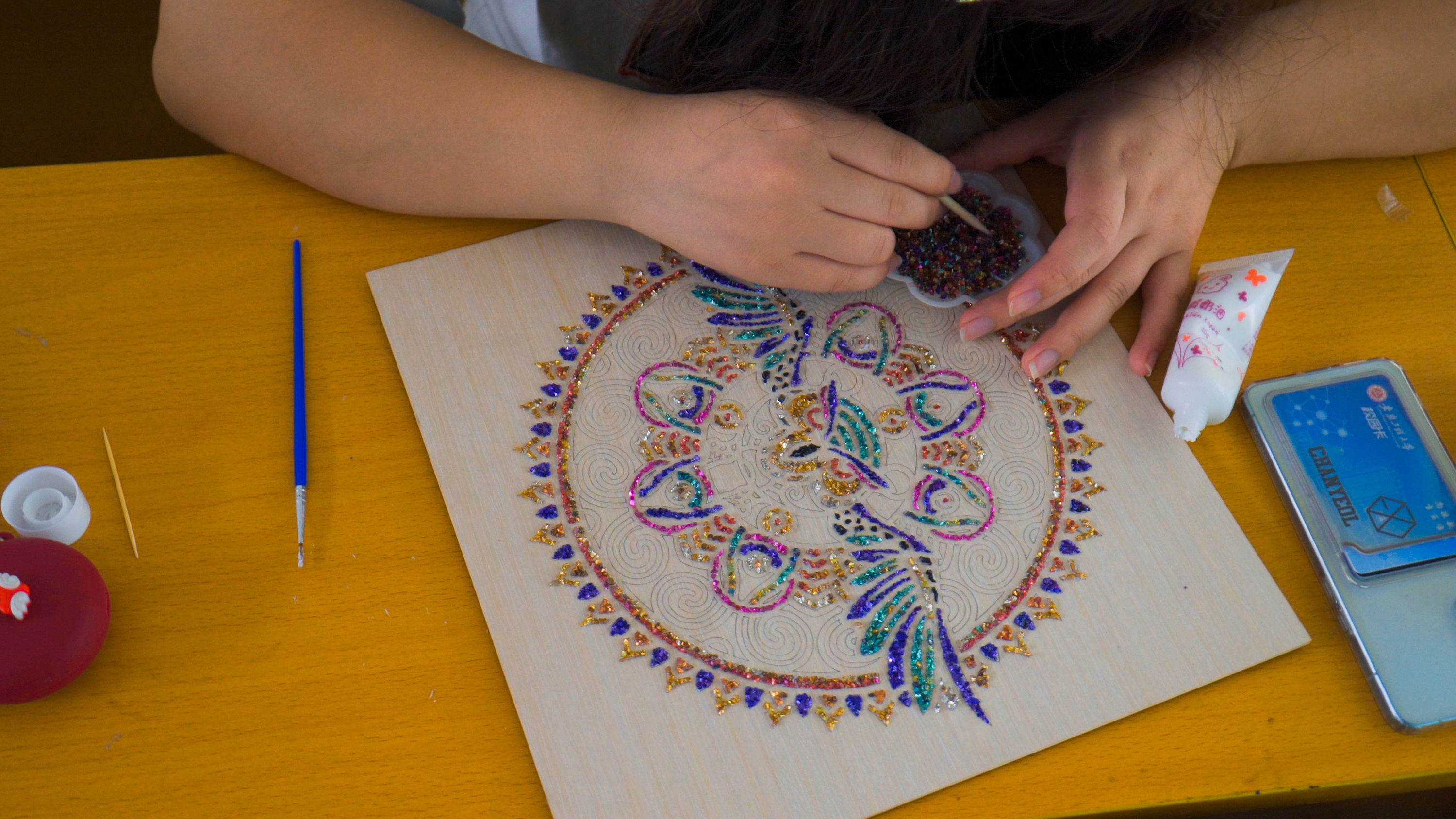 “碎玻璃拼贴画平均制作时长为17小时,通过1次1颗的碎玻璃粘黏充分打磨学生严谨、细致的实践品质,以期在其个人学业中精益求精。”张旭老师说道。在《变废为宝(废玻璃拼接DIY)》实践课上,同学们利用废弃的玻璃从设计画面到一步步的黏贴碎玻璃,最终完成一幅幅精美的贴画。张旭表示绘画创作是审美教育与美感教育的充分杂糅,将色彩搭配原理与技巧落实到拼贴设计中,充分提升了同学们认识美、理解美、欣赏美、创作美的能力。