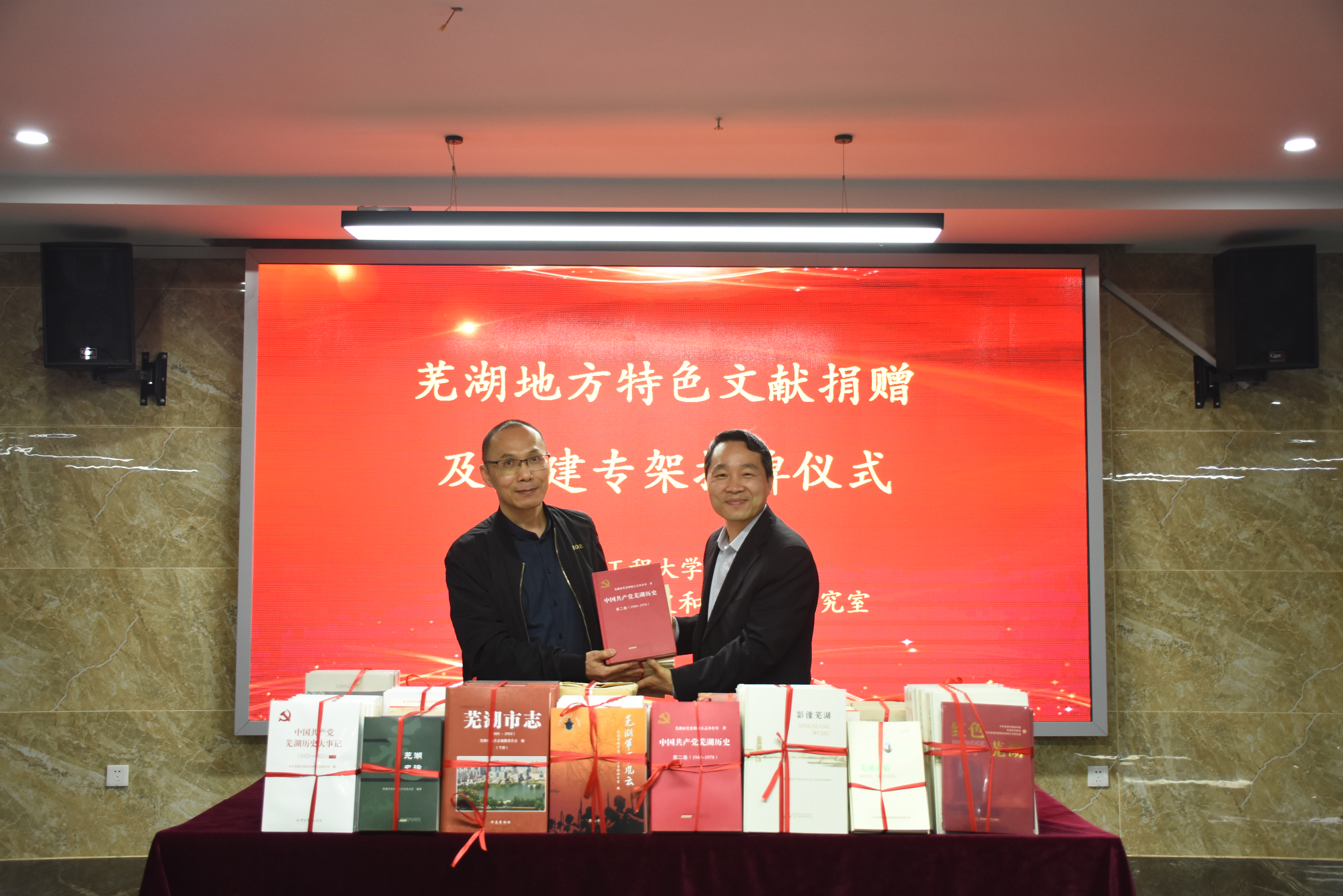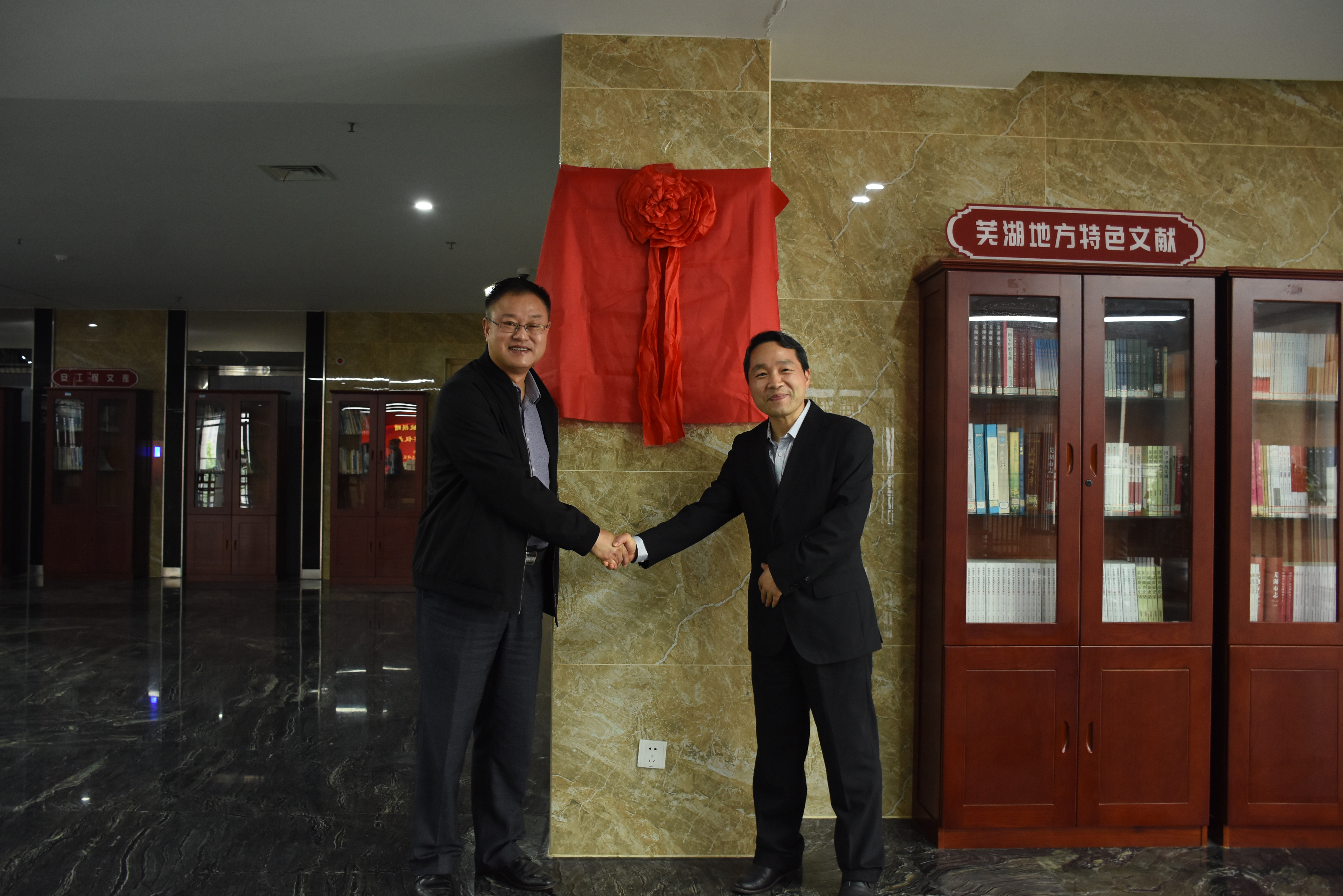 会后,在图书馆文澜阁,市委党史和地方志研究室向我校图书馆捐赠了地方特色文献图书,叶常林和魏超共同为“芜湖地方特色文献专架”揭牌。