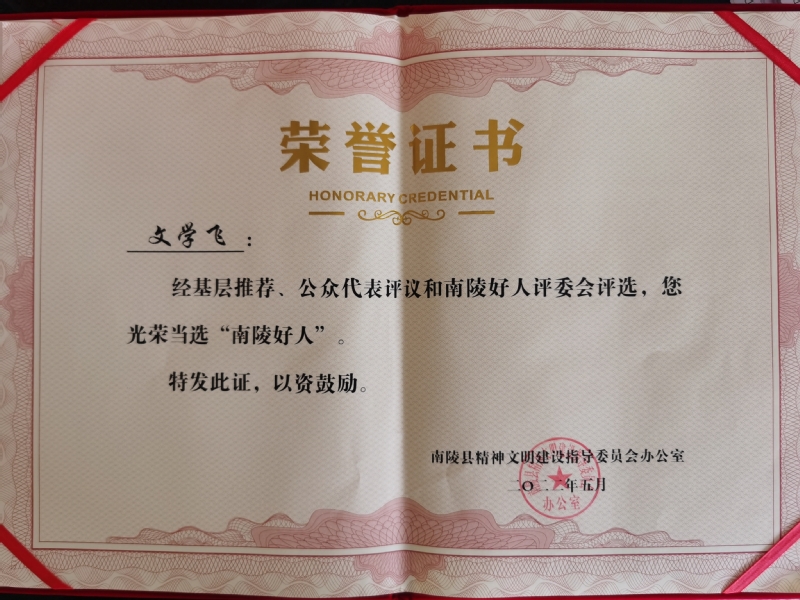 本网讯 近日,我校校园管理中心主任,何湾镇涧滩村乡村振兴工作队队长、第一书记文学飞荣获2022年第一季度“南陵好人”称号。文学飞自大学毕业以来无偿献血24载,现为芜湖市第55位“中华骨髓库”志愿捐献者、“应急献血者”;他曾参与“芜湖市春蕾计划”,先后资助25名贫困学生;他扎根一线,助人为乐,以实际行动模范践行共产党员的初心使命,努力成为一个学校和地方的“好人”。