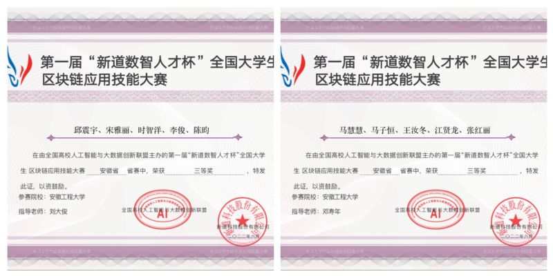 本网讯 为了激发和培养学生的创新意识和创造精神,数理与金融学院组织区块链工程专业学生参加首届“新道数智人才杯”全国大学生区块链应用技能大赛,经过激烈的角逐,斩获安徽省二等奖3项、三等奖2项。