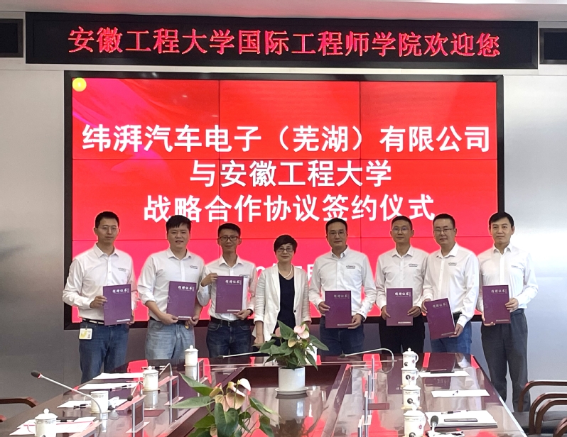 本网讯 7月1日,在国际工程师学院校区图文信息中心701会议室,学校与纬湃汽车电子(芜湖)有限公司签订战略合作协议。公司动力总成解决方案事业群全球运营副总裁史森、芜湖工厂总经理王国敏,校党委副书记、校友会会长苏国红,校党委常委、副校长费为银,校党委常委、教务处处长周晓宏及有关单位负责人出席会议。