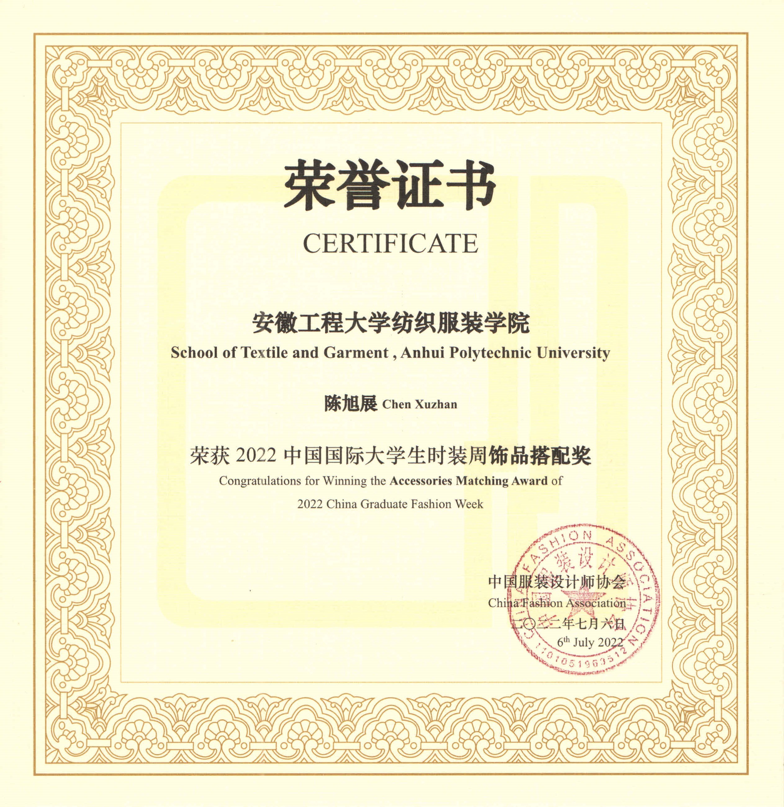 本网讯 7月盛夏,我校纺织服装学院服装与服饰专业2022届毕业作品“云上”开秀中国国际大学生时装周。在2022中国国际大学生时装周系列奖项中,纺织服装学院荣获2022中国国际大学生时装周人才培养成果奖。纺织服装学院陈旭展同学荣获服饰搭配奖专项奖。