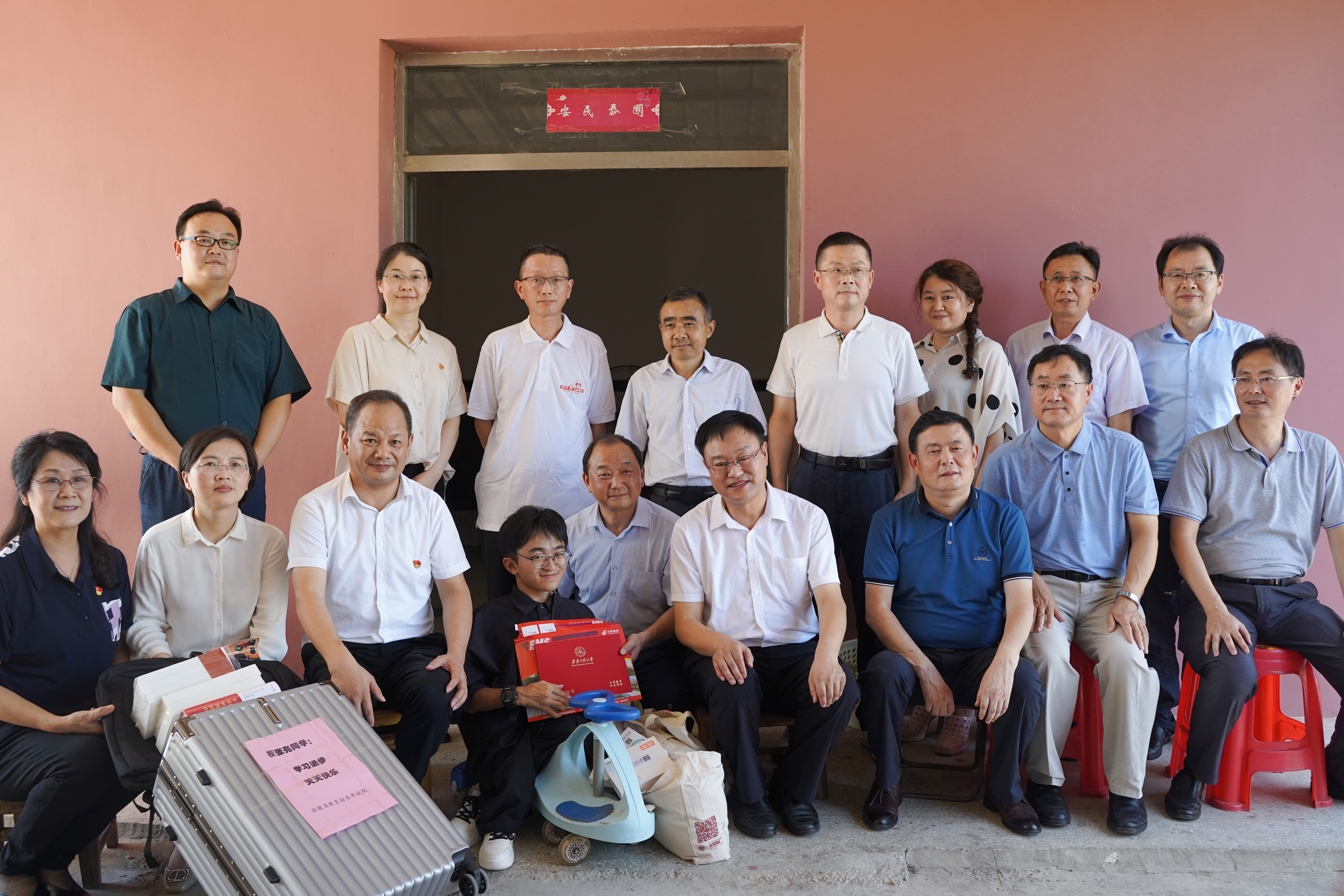 本网讯 7月22日,学校副校长叶常林,宣传部、教务处、学生处、后保处等相关部门负责人赴安庆市宿松县五里乡万元村,为2022级新生“扭扭车”男孩张亮送上一份“特殊的礼物”——新生录取通知书、补助金、学校研制的凉感空调被、智能语音鼠标等慰问品。省教育招生考试院党总支委员、副院长张连富,安庆市教育局、宿松县政府相关负责人等参与本次慰问活动。