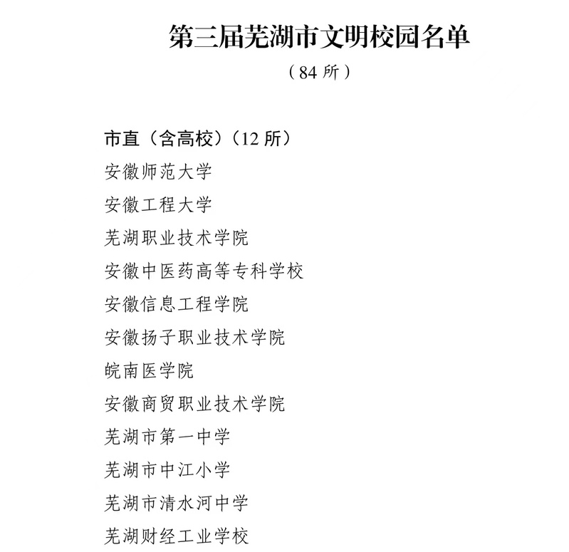 本网讯 近日,芜湖市精神文明建设指导委员会发布《关于命名第三届芜湖市文明校园的通报》,我校顺利通过评审,被授予“第三届芜湖市文明校园”荣誉称号。
