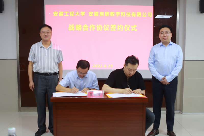 本网讯 8月29日,学校与安徽启链数字科技有限公司在图书馆综合楼1612会议室签订战略合作协议。副校长叶常林,杭州趣链科技有限公司创始人、CEO李伟,安徽启链数字科技有限公司总经理王寅达等出席签约仪式。教务处、社会合作处、数理与金融学院等单位相关负责人,数理与金融学院区块链工程系全体教师参加活动。