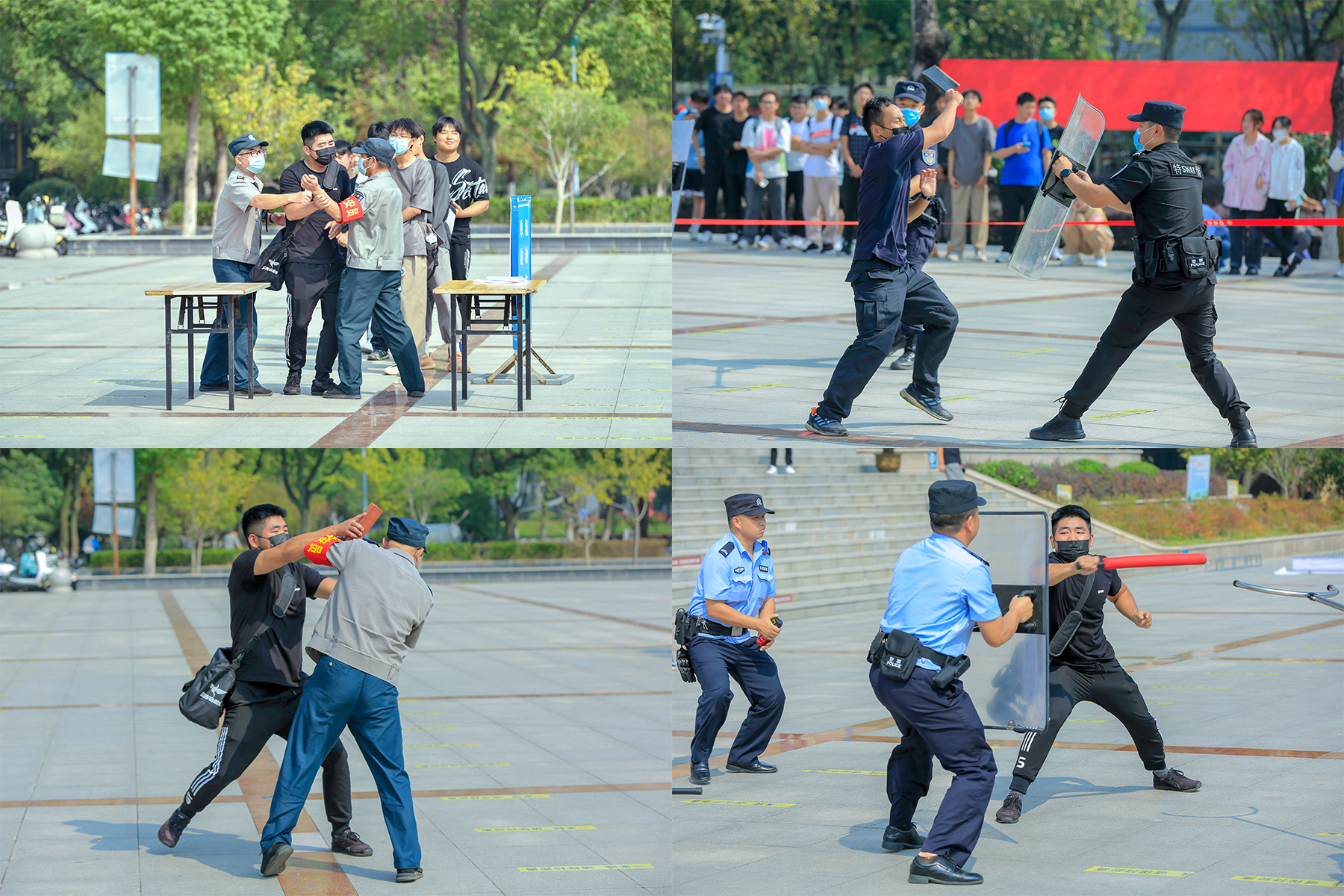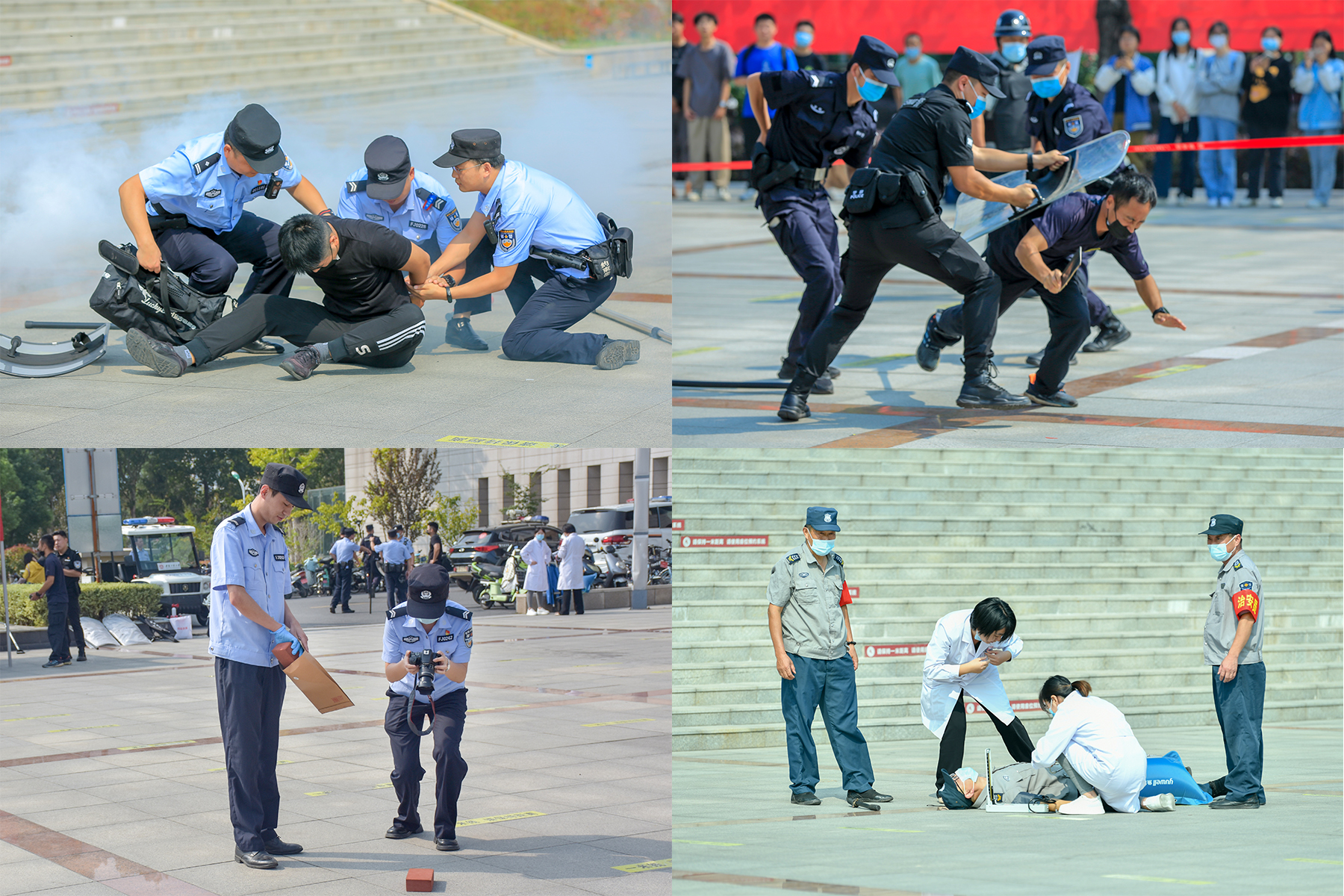 防暴演练现场,模拟了不遵守学校管理规定的两名外来人员不听劝阻强行闯入校园,与学校保安发生肢体冲突并持凶器实施暴力行为的事件。城东新区派出所警组、特警支队警组接警后第一时间赶到并拿取盾牌、钢叉、长警棍、抓捕器等装备将其制服,校警务站进行现场疏散,校医及时对受伤保安进行救治,事后对两名暴徒进行法律宣传。整个过程向我校师生展示了在面对暴恐袭击时,应如何正确地紧急避险、自防自救、报警求助,有效提高了师生的避险自救能力和校园安保人员应对突发事件的处置能力。