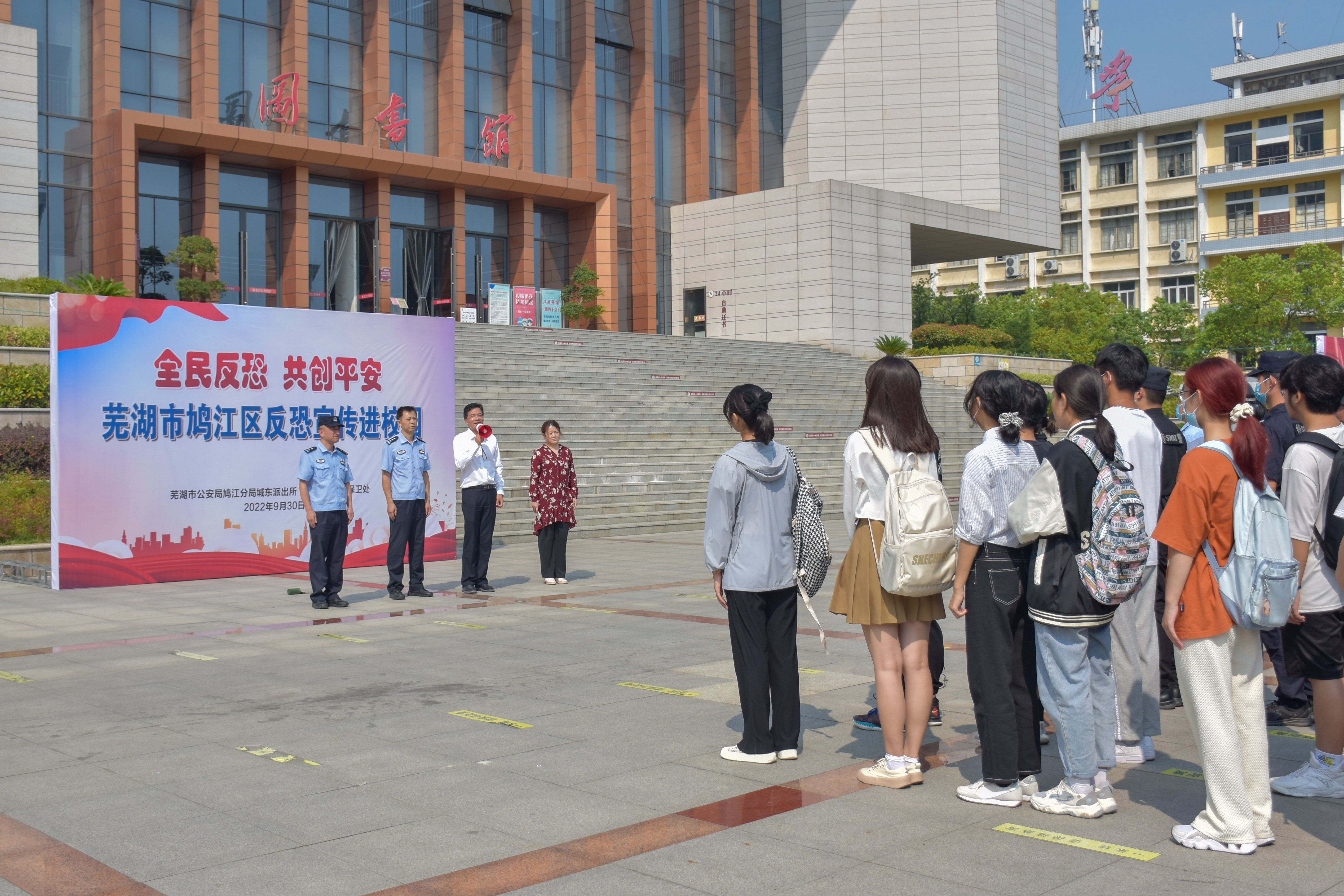本网讯 为提高全校师生在发生暴力恐怖事件时的应急处突能力,进一步深化全校师生的反恐防暴意识。9月30日,芜湖市鸠江区反恐宣传进校园活动在学校图书综合楼广场举办。本次活动由芜湖市公安局鸠江分局城东派出所主办,学校保卫处、宣传部协办。城东新区派出所巡逻警组、特警支队巡逻警组,学校保卫处、警务站、校医院等相关人员参加活动。