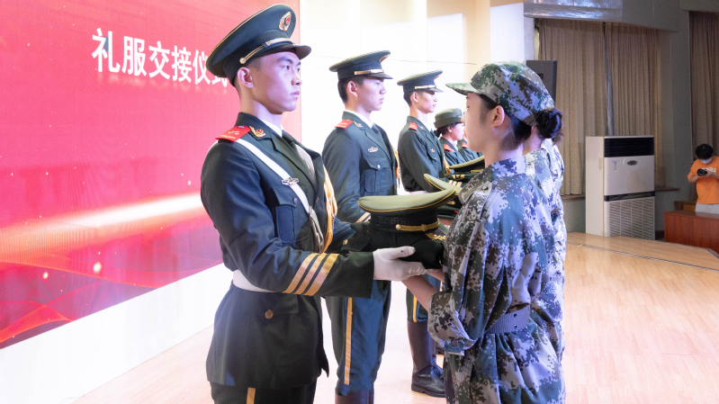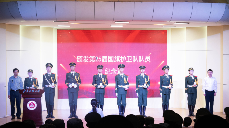 升旗仪式结束后,在学术报告厅举行国旗护卫队交接仪式。苏国红和郑健分别为26届国旗护卫队队员授旗、授枪。仪式上,宣读了26届国旗护卫队名单,为25届国旗护卫队代表颁发聘书和纪念章,并举行了交接仪式。与会人员集中观看国旗护卫队成长纪录片和第24届队员为国旗护卫队送上的祝福视频。