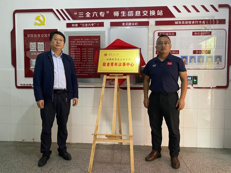 材料科学与工程学院党委书记郭广春与后勤保障处处长李敬华为宿舍青年议事中心揭牌。