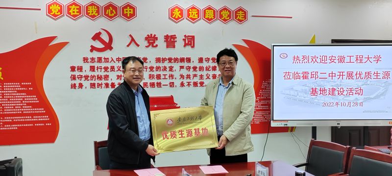本网讯 10月28日,我校副校长叶常林带领教务处(招生办)、相关学院和部门、片区负责人赴六安市霍邱县开展优质生源基地建设活动。在霍邱一中和霍邱二中举办“优质生源基地”签约挂牌仪式。霍邱县委教育工委委员、霍邱一中校长杨明生,霍邱二中党委书记、校长王勇等参加了本次活动。