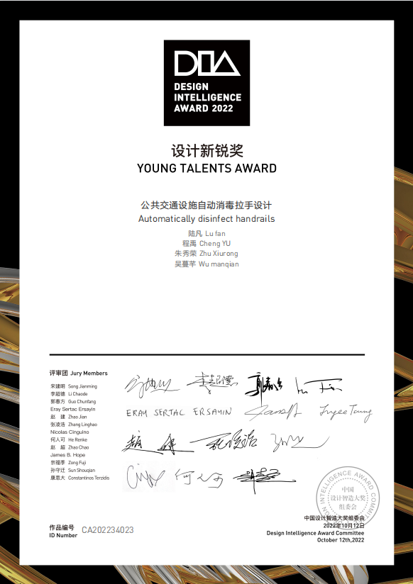 本网讯 3月12日晚,第七届中国设计智造大奖 (DIA) 颁奖典礼在绍兴柯桥国际会展中心盛大启幕。设计学院2021级艺术专业研究生陆凡、程禹、朱秀荣、吴蔓芊同学组成的团队创作的《公共交通设施自动消毒拉手设计》(指导教师:金东)荣获大赛概念组 “设计新锐奖”。