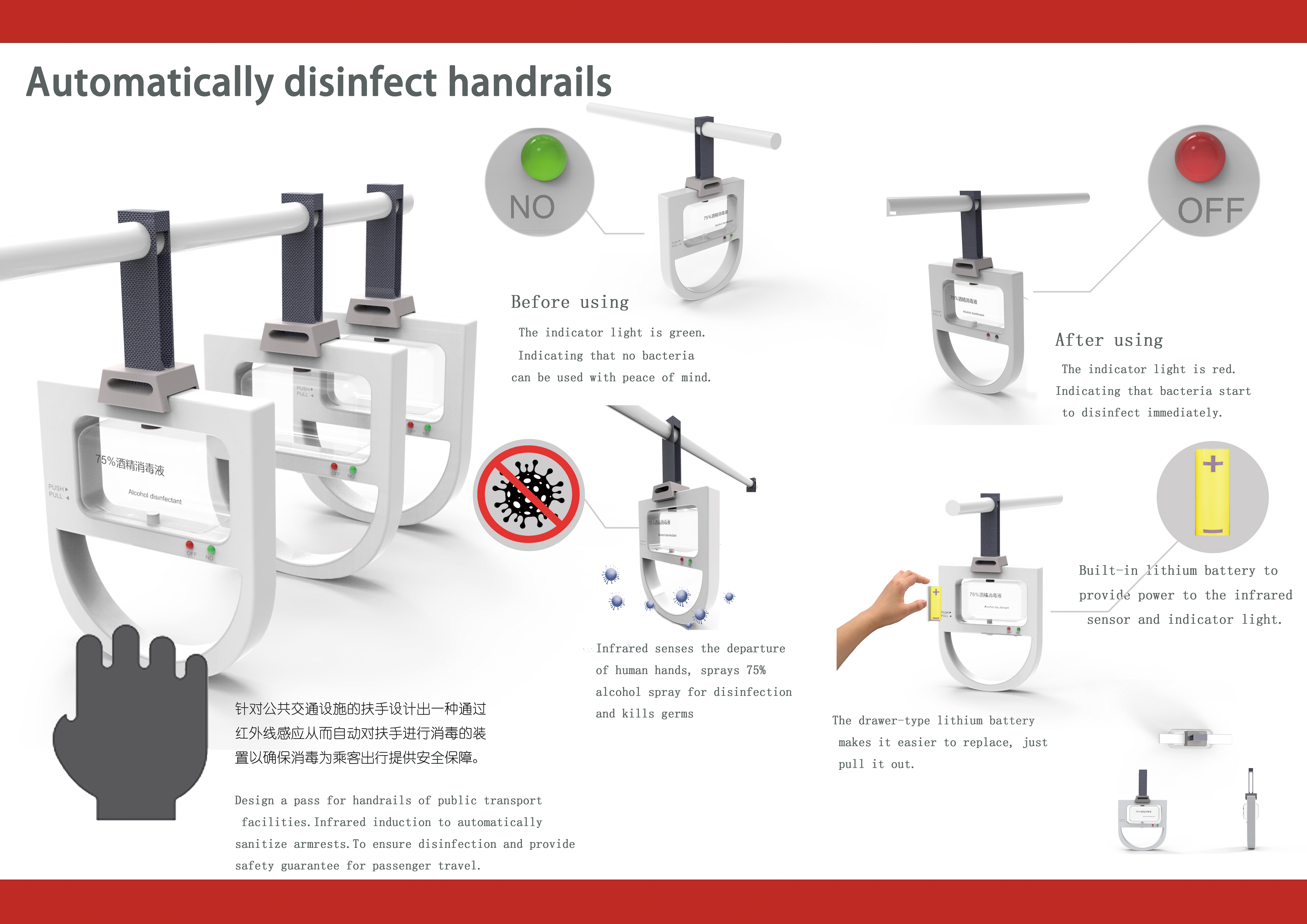 该设计以问题解决为导向,通过红外线感应而对拉手进行自动消毒,切实解决了公共交通设计消毒问题。公共交通设施的扶手,因受到乘客频繁使用,存留着大量细菌,人们在触摸这些扶手后容易造成交叉感染。针对这一痛点,设计出一种通过红外线感应从而自动对扶手进行消毒的装置,以达到节省人力和确保充分消毒、保证通勤安全的目的,为乘客出行提供安全保障。公共交通设施消毒扶手装置结构巧妙,具有易安装、易拆卸、适配性强等优点。在使用方式上采用了最直观的红绿灯可视化显示,当指示灯为绿色时表示已消毒,使用者可以安心使用扶手,而感应器感应到手部离开时,会自动对扶手进行消毒,指示灯则为红色。