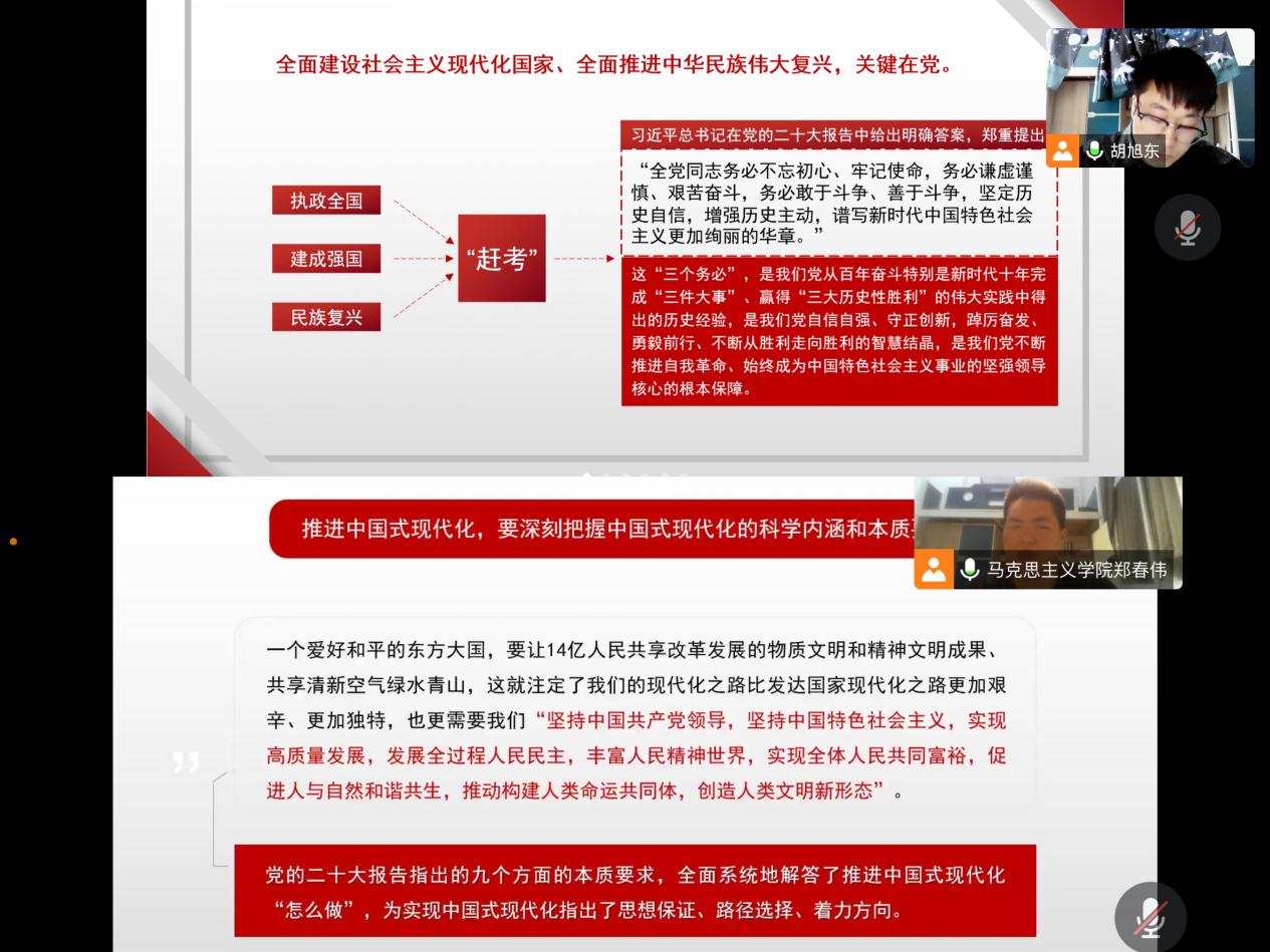 坚持学在前列。宣讲团坚持把党的二十大报告作为基础,把学原文作为基本要求并认真研读《党的二十大报告学习辅导百问》。宣讲员们在分享交流群中通过自主阅读、手写笔记、诵读金句等多种方式进行每日“云打卡”,推动党的二十大精神先学一步、学深一层。马克思主义学院虞满华、鲍小会、刘昆笛和毕亚琴老师作为指导教师全程参与宣讲指导工作,通过集体培训、分组备课、交流研讨、试讲演练等方式常态化开展理论知识、宣讲经验等方面的指导,确保了宣讲工作更有质量。