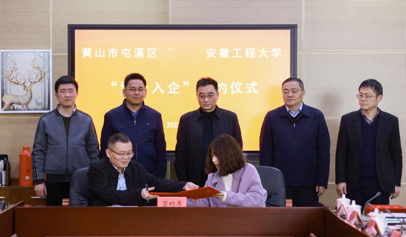 校地合作座谈会上,我校电气工程学院、生物与食品工程学院、化学与环境工程学院3位博士分别与黄山珍味坊食品有限公司、黄山金屹云智科技有限公司、黄山振州电子科技股份有限公司签订 “博士入企”合作协议。
