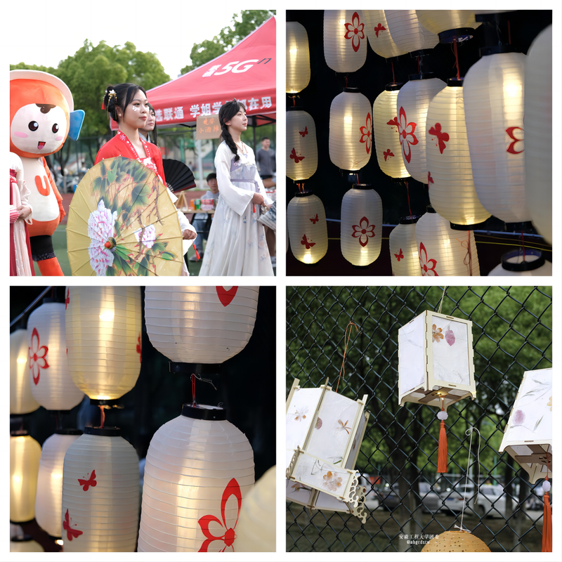 “和”相随,绽放无限活力。本次活动设置了花灯展览区、商铺美食区、游戏娱乐区三大特色区域,帮助学生放松身心,享受快乐的校园时光。在花灯展览区,大家通过猜灯谜来兑换相应的小礼品,在许愿墙上写下自己的心愿。在商铺美食区,同学们体验手工DIY的乐趣,品尝由生物与食品学院食协提供的美食和自酿啤酒。在游戏娱乐区,穿针引线、筷子运球、emoji 猜词等数十种游戏引来同学们驻足参加。