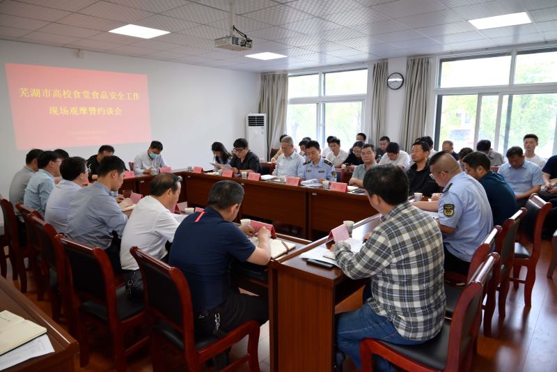 本网讯 5月25日,由芜湖市市场监督管理局主办,我校后勤保障处承办的芜湖市高校食堂食品安全工作现场观摩暨约谈会召开。学校党委常委、副校长郑健,芜湖市市场监督管理局四级调研员魏熙,鸠江区、弋江区、三山经开区市场监督管理局负责人,在芜高校后勤部门负责人、食品安全总监、食堂管理员、安全员等近50人参加活动。