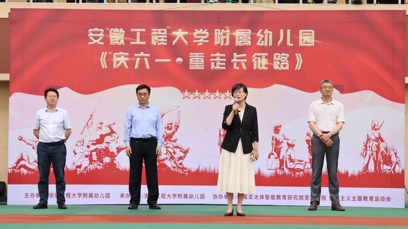 本网讯 5月31日,为庆祝“六·一”国际儿童节,校附属幼儿园在第一田径场开展“庆六一 重走长征路”红色教育亲子活动。校党委副书记、关工委主任苏国红,校党委常委、副校长郑健出席活动,后勤保障处相关负责人,附属幼儿园师生和学生家长参加活动。