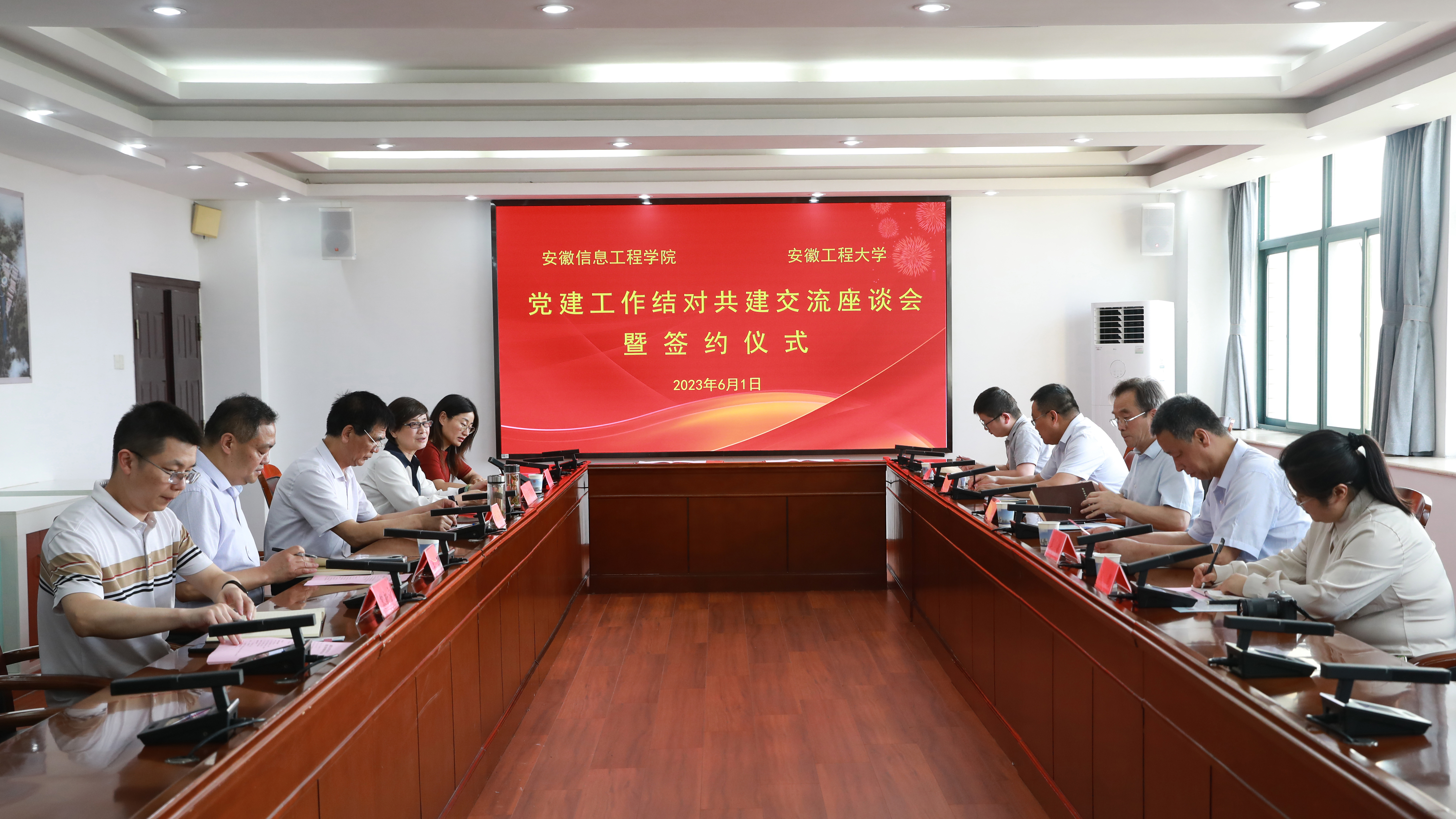 苏国红介绍了学校党建“三抓”工作和主题教育开展情况,并代表学校与安徽信息工程学院副校长、党委组织部部长汪忠国签订两校党建工作结对共建协议。