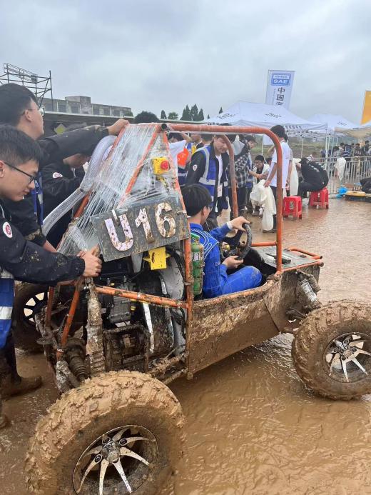 我校“雷电车队”接到赛事通知后,几乎每晚都在车队工作室鏖战到凌晨,成功解决了赛车在制动、悬架以及转向方面存在的不足,让赛车能够以最佳的状态迎接比赛。本次赛事的动态项目均在黄土地质进行,由于连日阴雨,使得赛道内的淤泥深度一度超过100mm,从而让赛车行进难度大大增加,这对车手的体能消耗、赛车的可靠性和通过性以及参赛队员们的意志品质都是一次严峻的考验。比赛结束后,车队成员返校后又立即投入到2023年度巴哈大赛赛车设计制造和改良的紧张任务中。