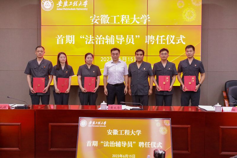 本网讯 6月15日,学校在图书综合楼201室举行首期“法治辅导员”聘任仪式。校党委常委、副校长郑健,市中院审判委员会专职委员、三级高级法官黄太华出席仪式并致辞。南陵县、鸠江区、经济技术开发区5名法官,各学院党委副书记,学生处、保卫处相关人员参加。聘任仪式由校党委常委、宣传部部长孙浩然主持。