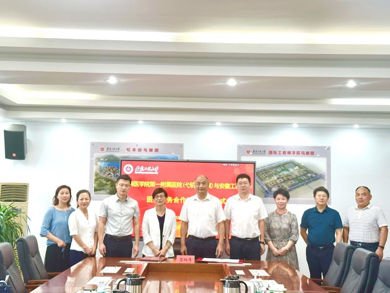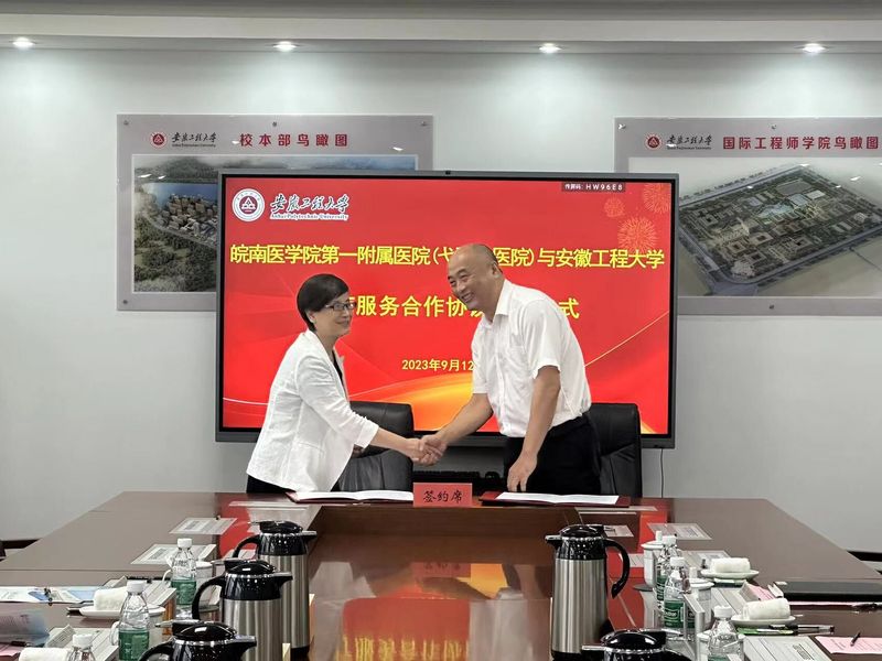 本网讯 为落实“我为师生做实事”,助力师生身心健康,9月12日,我校与皖南医学院第一附属医院(弋矶山医院)在A座1213会议室举行医疗服务合作协议签订仪式。会前校党委书记张志宏会见了皖南医学院第一附属医院(弋矶山医院)党委书记陈晓宏一行,校党委副书记苏国红出席并主持活动,办公室、人事处、工会、后勤保障处负责人参加会议。