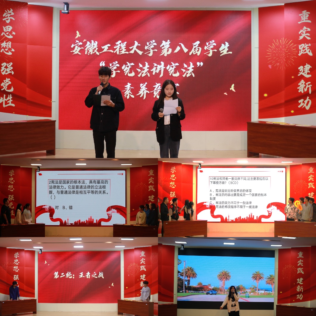 本次大赛由校团委、校法律协会主办,人文学院团委承办,旨在全面学习贯彻党的二十大精神,深入学习贯彻习近平法治思想,推动青年大学生宪法学习宣传教育常态化长效化,落实好安徽省教育厅关于开展第八届全省学生“学宪法讲宪法”活动的通知要求。比赛吸引了来自全校各学院1000余名学生报名,经过线上初赛比拼,设计学院、人文学院、数理与金融学院等8支队伍挺进决赛。决赛采用积分制,设置“逐鹿群雄”“王者之战”“问鼎冠军”“绝地求生”四个环节。竞赛中,各参赛选手冷静思考、迅速作答,展示出扎实的法律知识基础、良好的心理素质、出色的仪表仪态。
