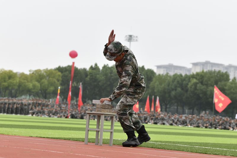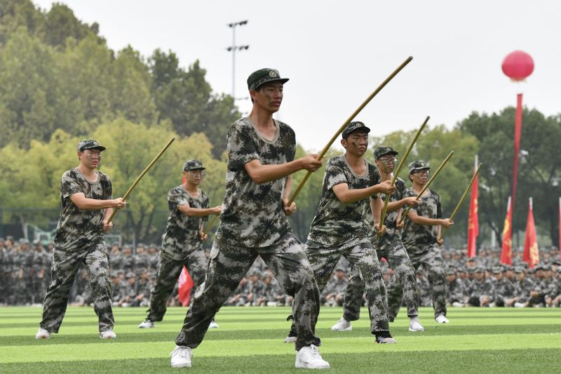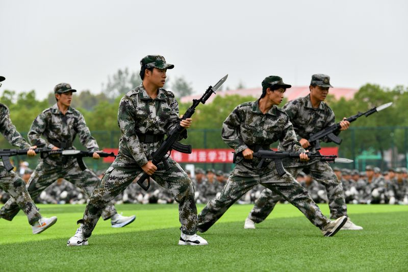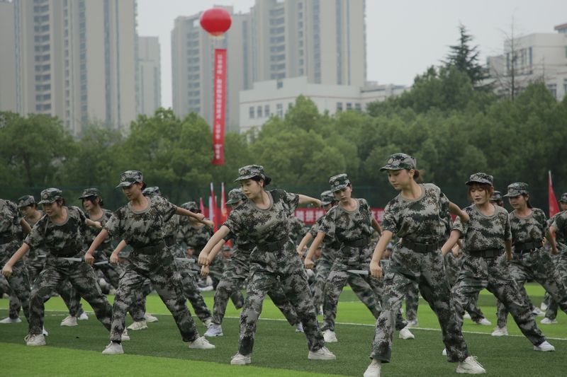 军训方阵迈着整齐的步伐依次通过主席台接受检阅,他们身姿挺拔、意气风发,动作整齐、口号响亮。国旗护卫队和部分连队代表军训团展示了队列训练成果,特色排分别展示了匕首操、刺杀操、应急棍、战术演练和枪操等技战术项目,教官进行了技能展示。