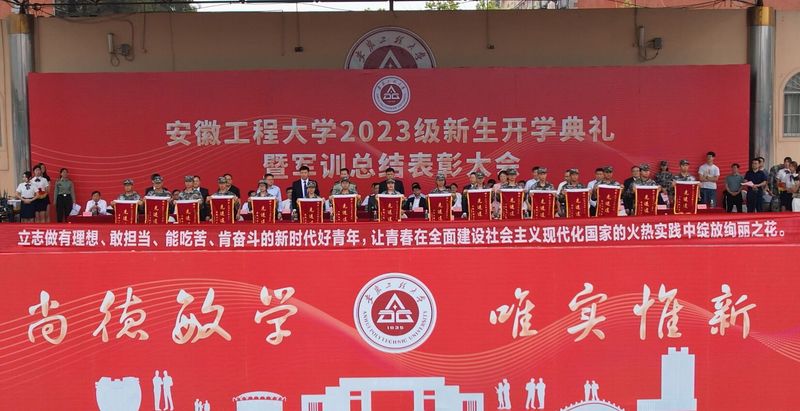 校党委书记张志宏代表学校向军训指导单位鸠江区人武部赠送锦旗。校党委常委、副校长凤权宣读2023级新生军训先进集体和先进个人的表彰决定,主席台前排领导和嘉宾为36个军训先进连和659名军训先进个人代表颁奖。
